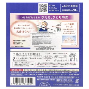 A Máscara de Olhos MegRhythm Steam permanece em uma temperatura confortável por 10 minutos, banhando os olhos e a delicada área dos olhos com um vapor quente. Este “banho de vapor para os olhos” ajuda a aliviar profundamente a tensão do dia e acalma a mente.