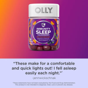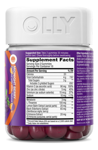 – OS PRODUTOS INTERNOS: OLLY as gomas de dormir para adultos combinam os benefícios das estrelas da defesa, sabugueiro, equinácea, vitamina C e zinco, com o suporte do sono da melatonina e da L-teanina, para uma noite restauradora quando você O que mais precisa