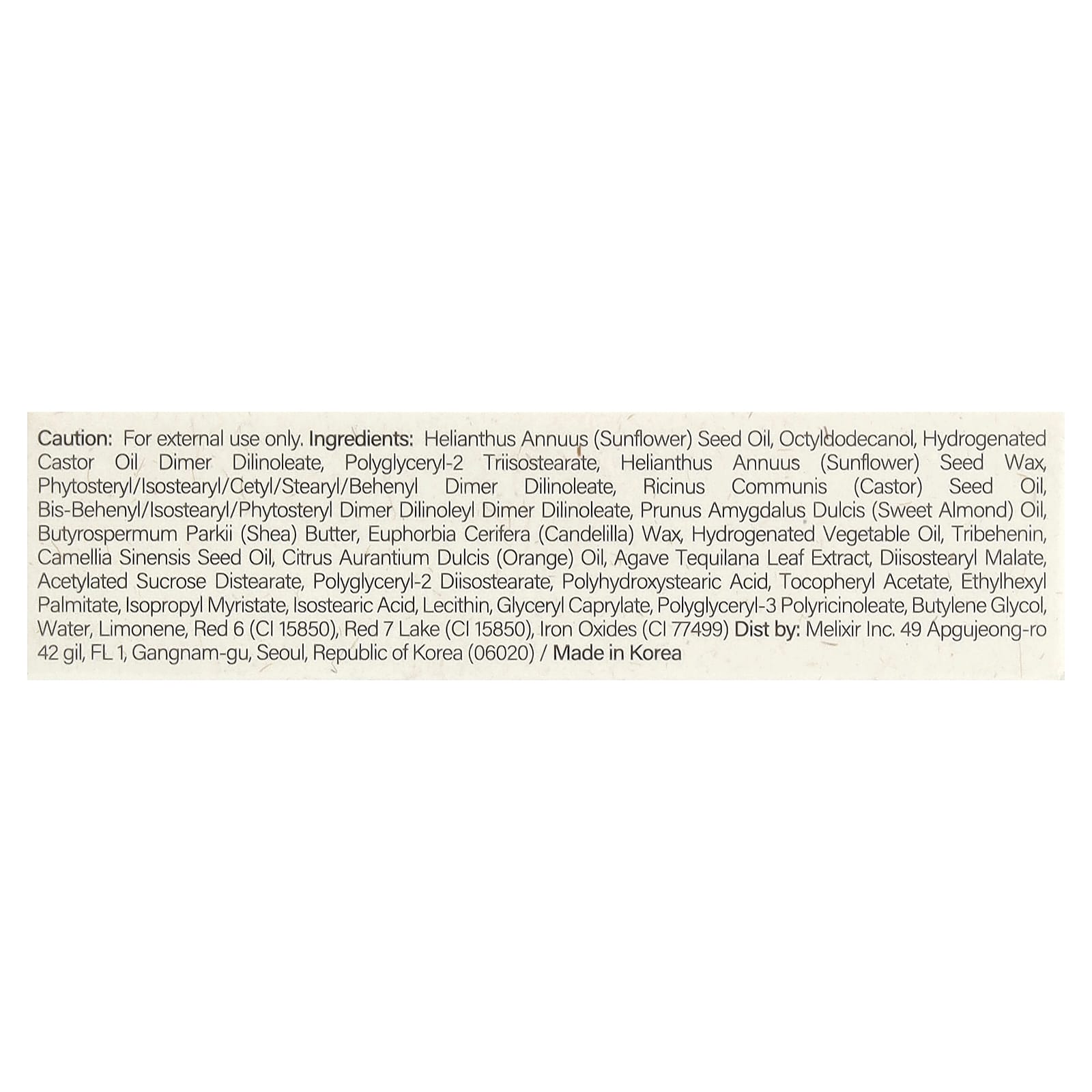 Óleo da semente de Helianthus annuus (girassol), octildodecanol, dilinoleato de rícino hidrogenado, polyglyceryl-2 triisostearate, cera da semente de Helianthus annuus (girassol), phytosteryl/isostearyl/cetyl/stearyl/behenyl dimer dilinoleate, óleo da semente de Ricinus communis (rícino), bis-behenyl/isostearyl/phytosteryl dimer dilinoleyl dimer dilinoleate, óleo de Prunus amygdalus dulcis (amêndoa doce), manteiga de Butyrospermum parkii (karité), cera de Euphorbia cerifera (candelila), óleo vegetal hidrogenado, tribohenin, óleo da semente de Camellia sinensis, óleo de Citrus aurantium dulcis (laranja), extrato de folha de Tequilana agave, diisostearyl malate, diestearato de sacarose acetilado, polyglyceryl-2 diisostearate, ácido polihidroxiesteárico, acetato de tocoferol, ethylhexyl palmitate, miristato de isopropila, isostearic acid, lecitina, caprilato de glicerila, polyglyceryl-3 polyricinoleate, butilenoglicol, água, limoneno, vermelho rubi (CI 15850), vermelho 7 laca de cálcio (CI 15850), óxidos de ferro (CI 77499).