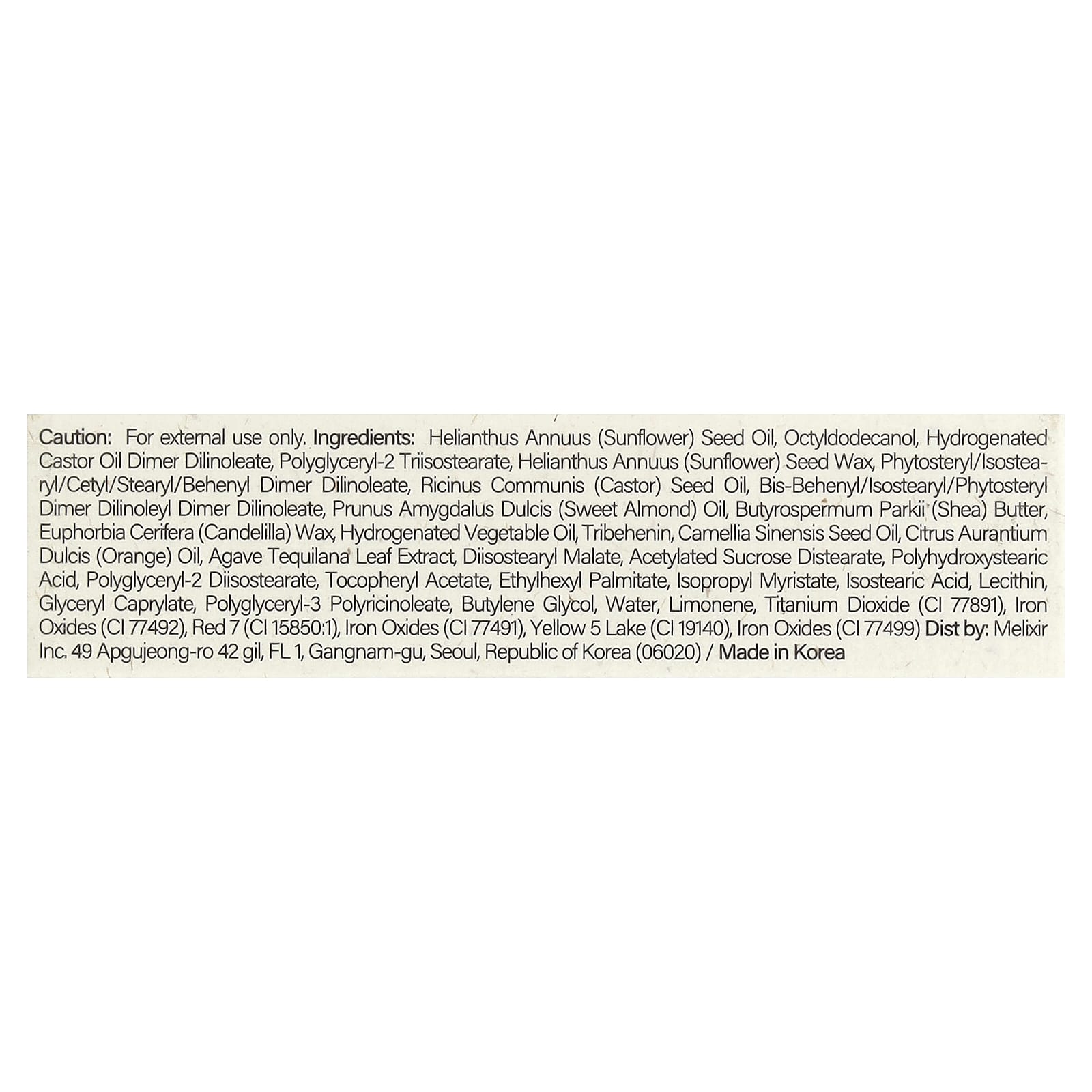 Óleo da semente de Helianthus annuus (girassol), octildodecanol, dilinoleato de rícino hidrogenado, polyglyceryl-2 triisostearate, cera da semente de Helianthus annuus (girassol), phytosteryl/isostearyl/cetyl/stearyl/behenyl dimer dilinoleate, óleo da semente de Ricinus communis (rícino), bis-behenyl/isostearyl/phytosteryl dimer dilinoleyl dimer dilinoleate, óleo de Prunus amygdalus dulcis (amêndoa doce), manteiga de Butyrospermum parkii (karité), cera de Euphorbia cerifera (candelila), óleo vegetal hidrogenado, tribohenin, óleo da semente de Camellia sinensis, óleo de Citrus aurantium dulcis (laranja), extrato de folha de Tequilana agave, diisostearyl malate, diestearato de sacarose acetilado, ácido polihidroxiesteárico, polyglyceryl-2 diisostearate, acetato de tocoferol, ethylhexyl palmitate, miristato de isopropila, isostearic acid, lecitina, caprilato de glicerila, polyglyceryl-3 polyricinoleate, butilenoglicol, água, limoneno, dióxido de titânio (CI 77891), óxidos de ferro (CI 77492), vermelho 7 (CI 15850:1), óxidos de ferro (CI 77491), tartrazina laca de alumínio (CI 19140), óxidos de ferro (CI 77499).