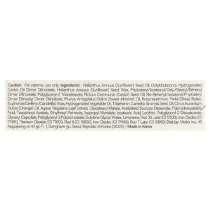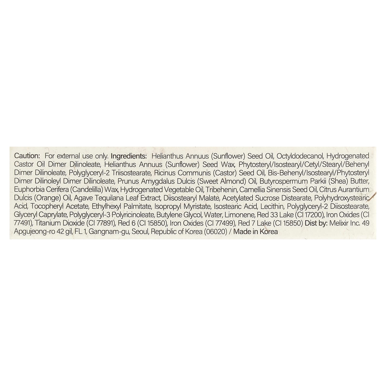 Óleo da semente de Helianthus annuus (girassol), octildodecanol, dilinoleato de rícino hidrogenado, cera da semente de Helianthus annuus (girassol), phytosteryl/isostearyl/cetyl/stearyl/behenyl dimer dilinoleate, polyglyceryl-2 triisostearate, óleo da semente de Ricinus communis (rícino), bis-behenyl/isostearyl/phytosteryl dimer dilinoleyl dimer dilinoleate, óleo de Prunus amygdalus dulcis (amêndoa doce), manteiga de Butyrospermum parkii (karité), cera de Euphorbia cerifera (candelila), óleo vegetal hidrogenado, tribohenin, óleo da semente de Camellia sinensis, óleo de Citrus aurantium dulcis (laranja), extrato de folha de Tequilana agave, diisostearyl malate, diestearato de sacarose acetilado, ácido polihidroxiesteárico, acetato de tocoferol, ethylhexyl palmitate, miristato de isopropila, isostearic acid, lecitina, polyglyceryl-2 diisostearate, caprilato de glicerila, polyglyceryl-3 polyricinoleate, butilenoglicol, água, limoneno, vermelho 33 laca de alumínio (CI 17200), óxidos de ferro (CI 77491), dióxido de titânio (CI 77891), vermelho rubi (CI 15850), óxidos de ferro (CI 77499), vermelho 7 laca de alumínio (CI 15850).