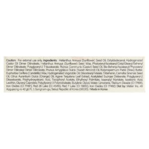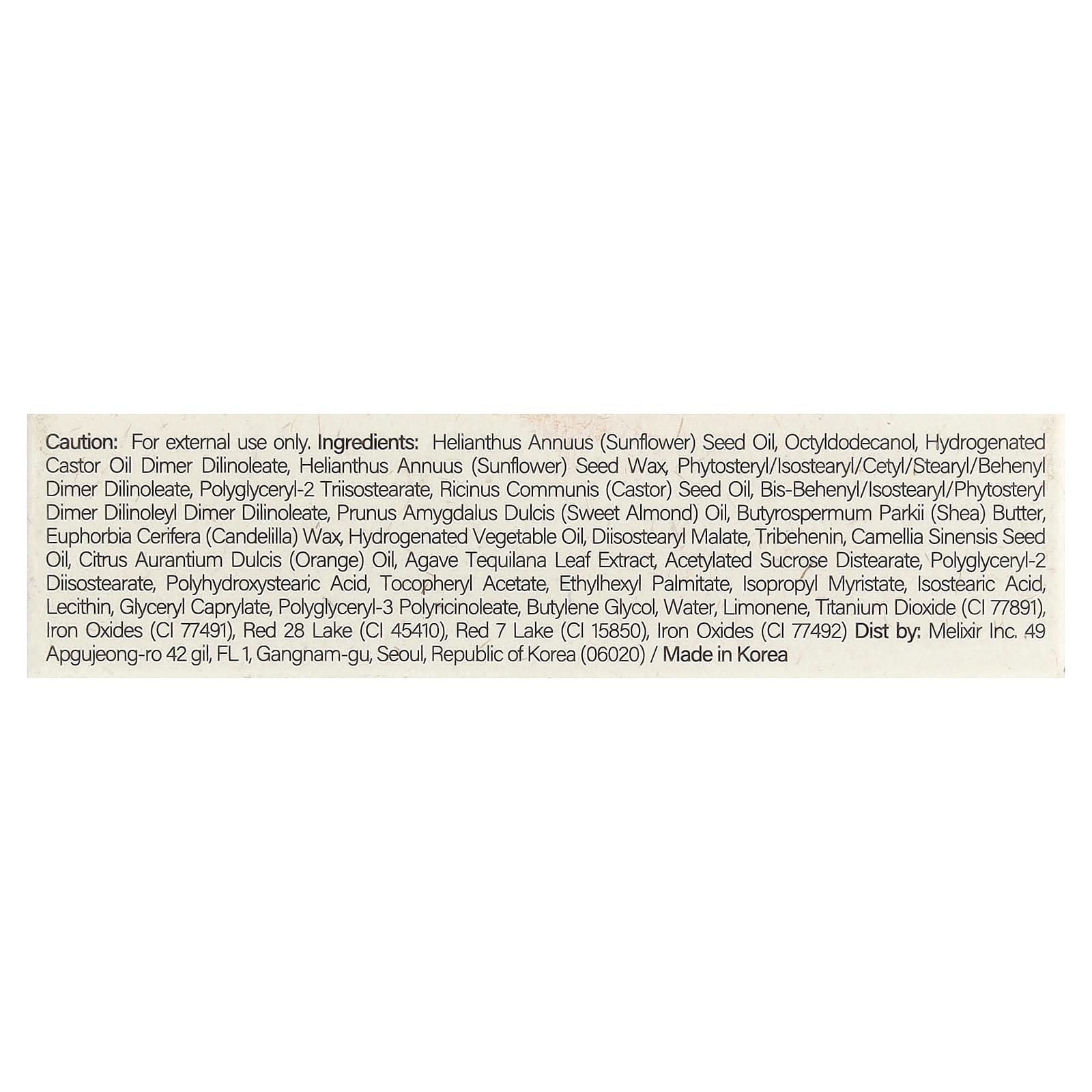 Óleo da semente de Helianthus annuus (girassol), octildodecanol, dilinoleato de rícino hidrogenado, cera da semente de Helianthus annuus (girassol), phytosteryl/isostearyl/cetyl/stearyl/behenyl dimer dilinoleate, polyglyceryl-2 triisostearate, óleo da semente de Ricinus communis (rícino), bis-behenyl/isostearyl/phytosteryl dimer dilinoleyl dimer dilinoleate, óleo de Prunus amygdalus dulcis (amêndoa doce), manteiga de Butyrospermum parkii (karité), cera de Euphorbia cerifera (candelila), óleo vegetal hidrogenado, diisostearyl malate, tribohenin, óleo da semente de Camellia sinensis, óleo de Citrus aurantium dulcis (laranja), extrato de folha de Tequilana agave, diestearato de sacarose acetilado, polyglyceryl-2 diisostearate, ácido polihidroxiesteárico, acetato de tocoferol, ethylhexyl palmitate, miristato de isopropila, isostearic acid, lecitina, caprilato de glicerila, polyglyceryl-3 polyricinoleate, butilenoglicol, água, limoneno, dióxido de titânio (CI 77891) óxidos de ferro (CI 77491), vermelho 28 laca de alumínio (CI 45410), vermelho 7 laca de cálcio (CI 15850), óxidos de ferro (CI 77492).