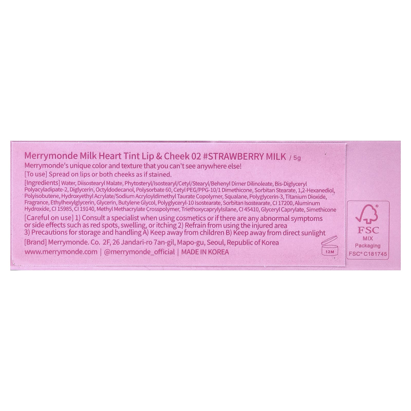 Merrymonde Milk Heart Tint Lábios e Cheek 02 Leites de Morango 5 g – Merrymonde Beleza Maquiagem Lábios Lip Tint Rosto Blushes K-Beauty.