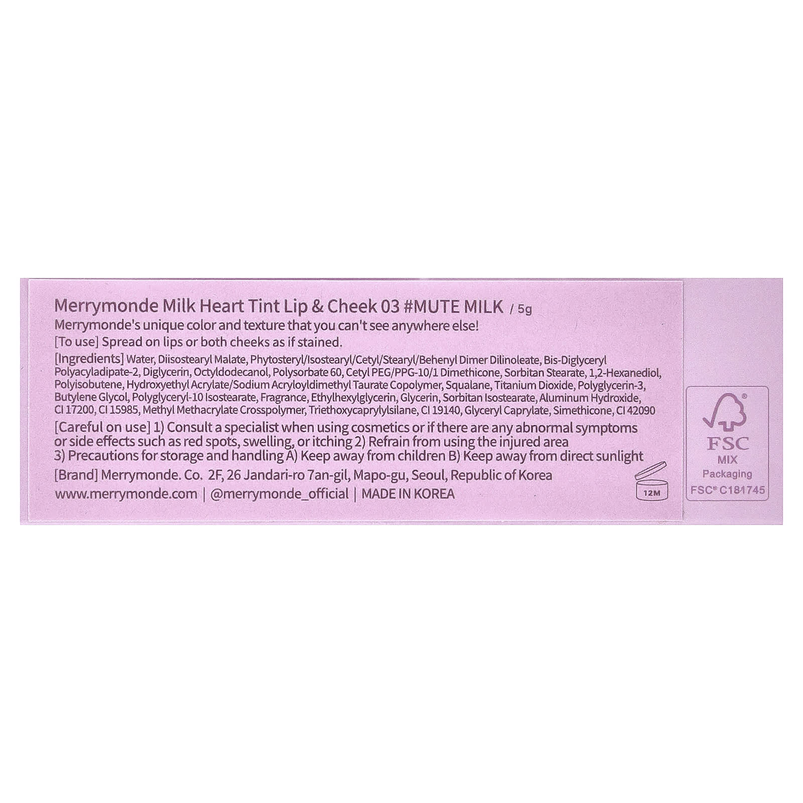 Merrymonde Milk Heart Tint Lábios e Cheek 03 Mute Milk 5 g – Merrymonde Beleza Maquiagem Lábios Lip Tint Rosto Blushes K-Beauty.