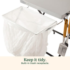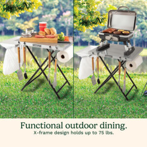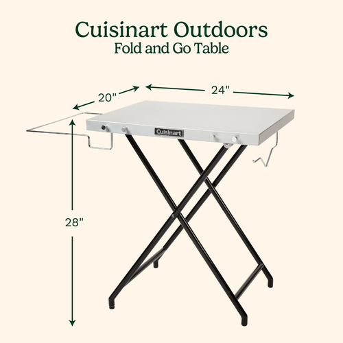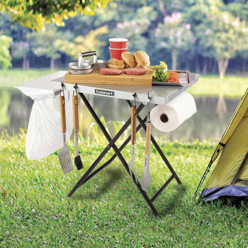 Mesa de preparação Cuisinart Fold n Go, mesa dobrável portátil e suporte para churrasco com ganchos para ferramentas, porta-sacos de lixo, porta-toalhas de papel, estação de preparação de alimentos em aço 24 x 20, perfeita para churrascos, portas traseiras e acampamentos – MULTIFUNCIONAL: a mesa espaçosa de aço de 24" x 20" serve como superfície de preparação de alimentos ou suporte resistente para churrasqueiras portáteis, suportando até 50 libras. – Fácil configuração e armazenamento: dobrável em X. O design permite uma configuração rápida e se dobra para armazenamento e transporte compactos. – ARMAZENAMENTO EMBUTIDO: inclui um porta-sacos de lixo para sacos de 1330 galões e um toalheiro de papel para facilitar a costura limpe enquanto cozinha. – GANCHOS DE FERRAMENTAS: equipados com 4 ganchos para manter as ferramentas ou utensílios para grelhar ao alcance. – LEVE E PORTÁTIL: Projetado para transporte fácil, tornando-o ideal para acampamentos, uso não autorizado ou churrascos no quintal.