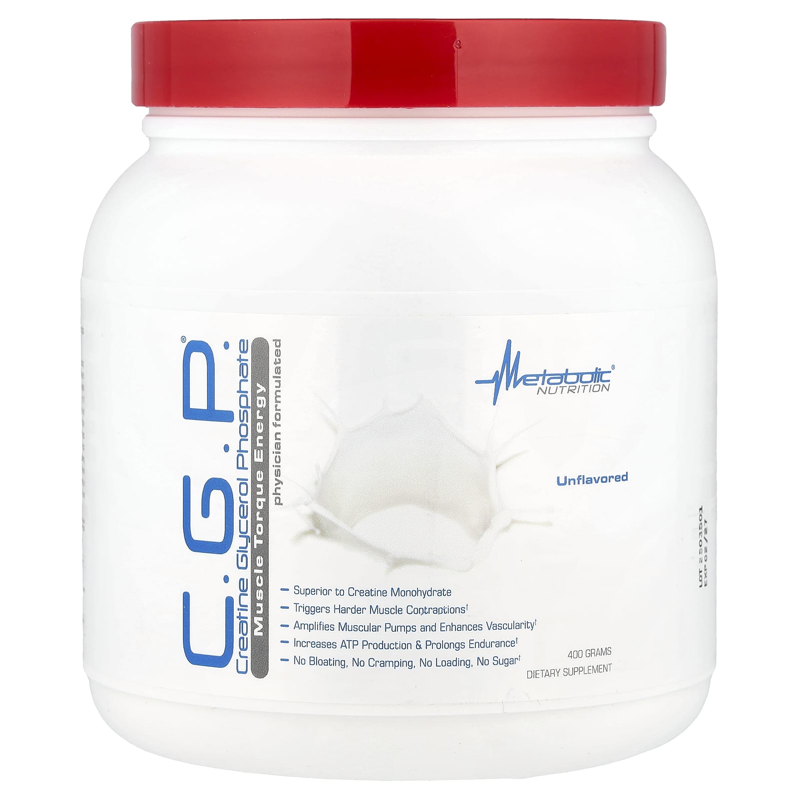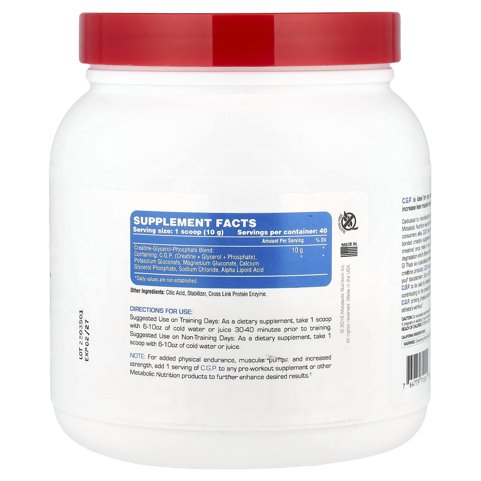 Dedicada a fabricar suplementos nutricionais de alta qualidade, respaldada por pesquisas científicas e formulada por um médico, a Metabolic Nutrition foi a primeira a apresentar o Fosfato de Creatina Glicerol ao mercado. Aprovado por médicos, atletas e consumidores, o CGP tem a diferença de fornecer a pura “Energia de Torque Muscular” pura em um suplemento de creatina ligada por fosfato 100% estável e absorvível. Ao contrário da creatina mono-hidratada, que principalmente se converte em “Creatinina” [uma forma tóxica e inutilizável de creatina] quando misturada em líquido, a estrutura química do CGP é forte o suficiente para ser misturada em água ou outras bebidas sem qualquer degradação que afete outros produtos de creatina. Desenvolvido com um composto de glicerol, o CGP é capaz de acelerar a absorção no GI por uma via especializada, eliminando assim todos os efeitos colaterais negativos, como cólicas, inchaço e náuseas, associados à maioria dos produtos de creatina. A estrutura química superior ligada por fosfato do CGP permanece completamente intacta e é diretamente assimilada pela corrente sanguínea. Devido à alta taxa de absorção do CGP, uma bebida na “fase de carregamento” ou com “alto teor de carboidratos” não é necessária, permitindo que o CGP seja usado por indivíduos com dietas baixas em carboidratos. O CGP atua como seu próprio reservatório de fosfato de alta energia e eletrólito, contribuindo para a produção de ATR, retardando a fadiga, aumentando a força e magnificando a resistência. Os ingredientes do CGP não apenas prolongam a resistência física, mas também melhoram a utilização de nutrientes e a recuperação muscular, tornando-o um suplemento essencial no treino de qualquer atleta.