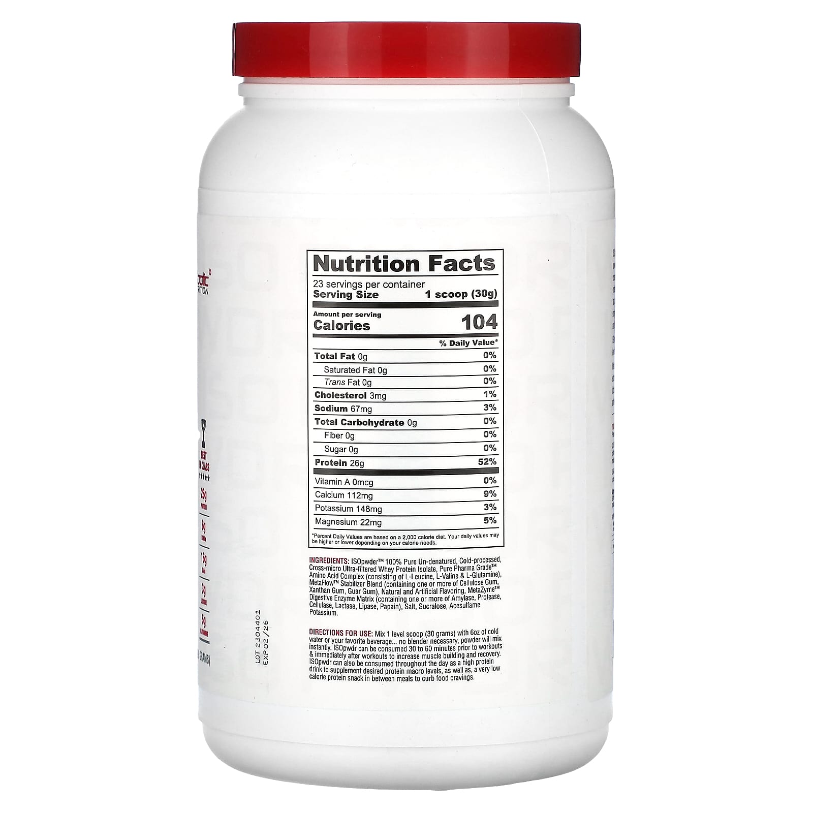 ISOpwdr ™ 100% puro não desnaturado, isolado de proteína de whey ultrafiltrado, processado a frio, Complexo de aminoácidos Pure Pharma Grade ™ (consistindo em l-leucina, l-valina e amp; l-glutamina), mistura de estabilizador MetaFlow ™ (contendo uma ou mais gomas de celulose, goma de xantana, goma guar), sabores naturais e artificiais, Matriz de enzimas digestivas MetaZyme ™ (contendo uma ou mais amilases, protease, celulase, lactase, lipase, papaína), sal, sucralose, acessulfamo potássico