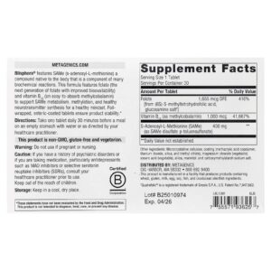 Blisphora® apresenta SAMe (s-adenosil-L-metionina), um composto nativo do corpo que é um componente de muitas reações bioquímicas. Esta fórmula contém folato (a próxima geração de folato com biodisponibilidade melhorada) e vitamina B2 (uma mecobalamina de fácil absorção) para auxiliar o metabolismo, a metilação e a síntese de neurotransmissores saudáveis da SAMe, promovendo uma mente saudável. Os comprimidos envoltos em papel alumínio e com revestimento entérico garantem a estabilidade do produto.