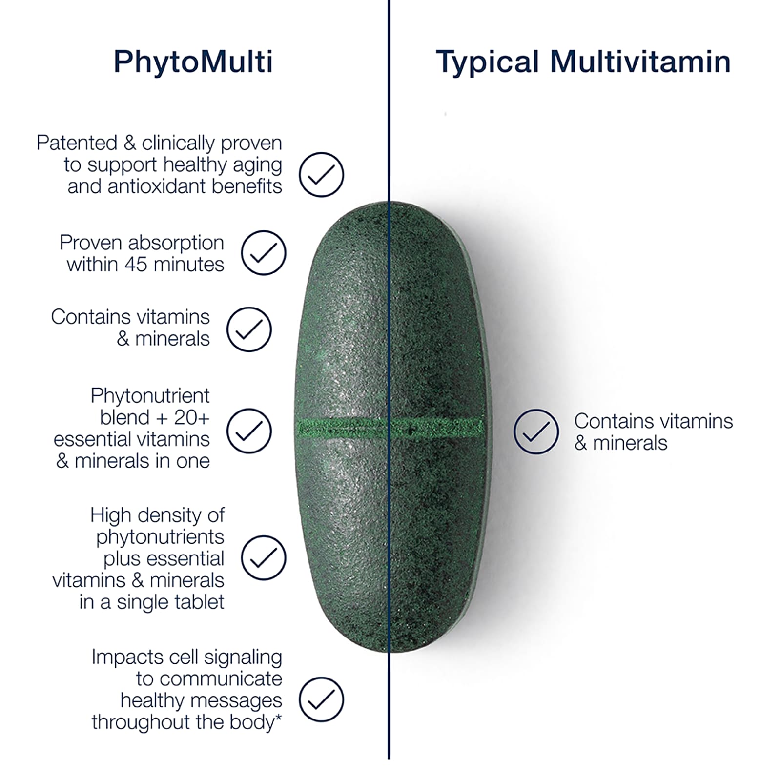 O Multivitamínico PhytoMulti® oferece uma mistura patenteada de 13 extratos vegetais concentrados e fitonutrientes provenientes da natureza para auxiliar a saúde celular, envelhecimento saudável, equilíbrio nutricional e bem-estar diário.