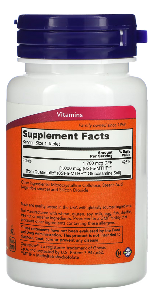 Metilfolato Methyl 1000mcg Now Foods 90 Tablets / No Brasil O metilfolato é a forma de folato biologicamente ativa e natural que é usada para funções corporais fundamentais. Ao contrário do ácido fólico normal, o metilfolato demonstrou penetrar na barreira hematoencefálica, onde atua ajudando no apoio ao bem estar. Dito de outra maneira, é uma forma patenteada de metilfolato que demonstrou biodisponibilidade superior à do folato de fontes alimentares, com esta formula potente você pode facilmente complementar sua dieta alimentar com as quantidades necessárias desta substância. Outros Ingredientes: Celulose Microcristalina, Ácido Esteárico (fonte vegetal) e Dióxido de Silício. Fabricado sem ingredientes de trigo, glúten, soja, leite, ovo, peixe, marisco, nozes ou gergelim. Sugestões de uso: Tome 1 comprimido por dia com uma refeição. Cuidados: Apenas para adultos, busque orientação se estiver grávida ou amamentando antes de antes de usar este produto. Mantenha fora do alcance de crianças Armazenar em local fresco e seco após a abertura. Dimensões: 4,7 x 4,7 x 8,9cm Peso: 0,036 Itens inclusos: 1x Frasco com 90 tablets VIDE VALIDADE