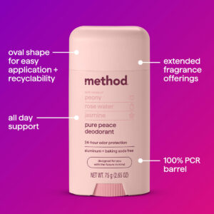 Método Desodorante, paz pura, água de rosas, peônias e notas de sal marinho rosa, proteção contra odores 24 horas, 2,65 onças – contém (1) 2,65 onças de alumínio e desodorante em bastão sem bicarbonato de sódio. – Proteção contra odores de 24 horas – formulada sem alumínio, bicarbonato de sódio, parabenos ou ftalatos. – feita de plástico 100% reciclado (PCR) – a fragrância pura paz tem notas de rosa água, peônias e sal marinho rosa e cheira a doce serenidade.