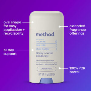 Método: desodorante, simplesmente nutritivo, coco, leite de arroz e manteiga de karité, 24 horas de proteção contra odores, 2,65 onças – contém (1) 2,65 onças de alumínio e desodorante em bastão sem bicarbonato de sódio. – Proteção contra odores de 24 horas – formulado sem alumínio, bicarbonato de sódio, parabenos ou ftalatos. – feito de plástico 100% reciclado (PCR) – a fragrância Simply Nutre tem notas de coco, leite de arroz e manteiga de karité e cheira a um momento luxuoso para mim.