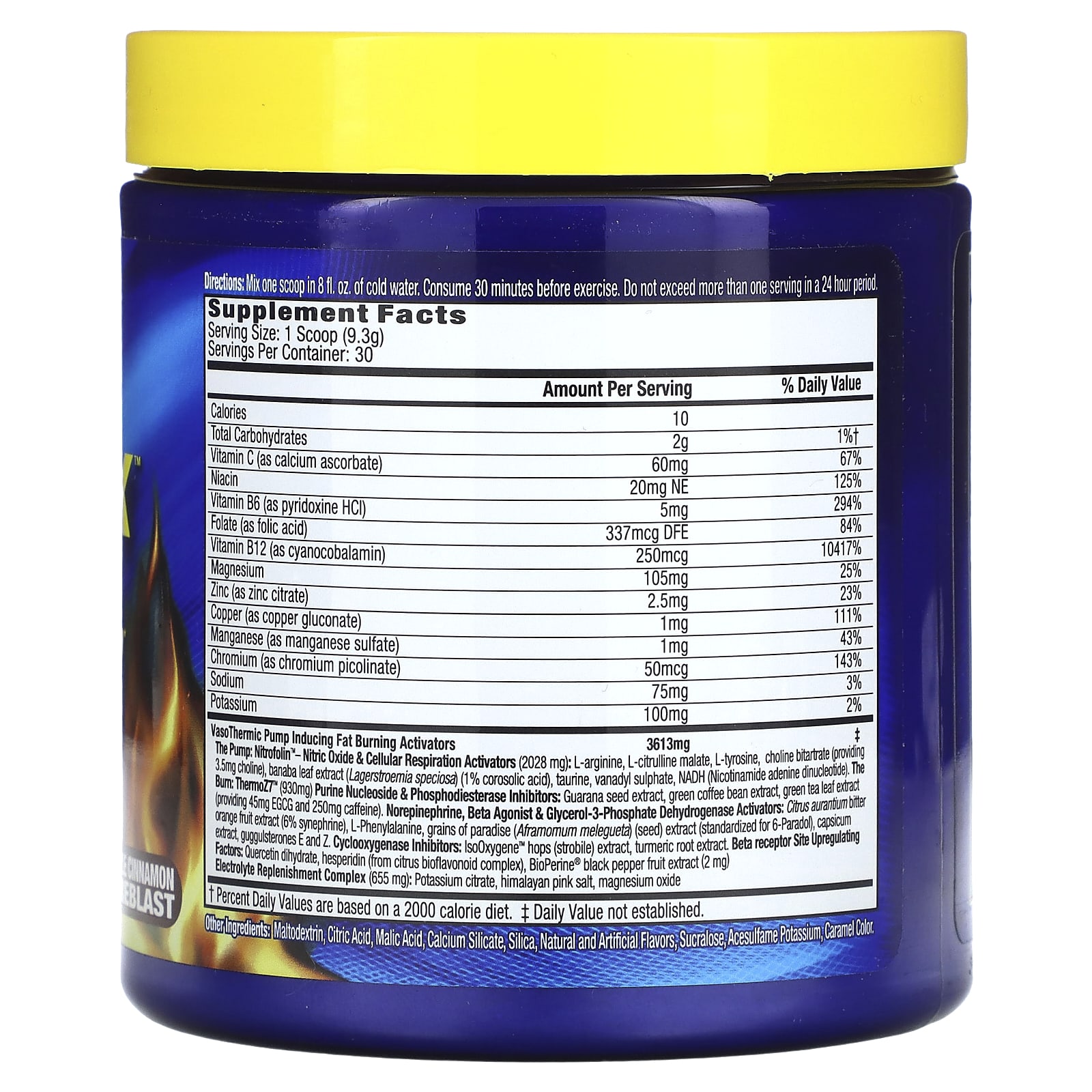 | Bomba VasoThermic, incluindo ativadores de queima de gordura A Bomba: Nitrofolin ™ – Óxido Nítrico e Ativadores da Respiração Celular (2028 mg): L-arginina, L-citrulina malato, L-tirosina, bitartarato de colina (fornecendo 3,5 mg de colina), extrato de folha de banaba (Lagerstroemia speciosa) (1% de ácido corosólico), taurina, sulfato de vanadil, NADH (Nicotinamide adenine dinucleotide). The Burn: Inibidores de Nucleosídeo e Fosfodiesterase ThermoZ7™ (930 mg): Extrato da semente de guaraná, extrato do grão de café verde, extrato da folha de chá verde (fornecendo 45 mg de EGCG e 250 mg de cafeína). Ativadores de Norepinefrina, Beta Agonista e Glicerol-3-Fosfato: Extrato da fruta Citrus aurantium biter laranja (6% sinefrina), L-Fenilalanina, extrato de grãos do paraíso (Aframomum melegueta) (semente) (padronizado para 6-Paradol), extrato de capsicum, guggulsteronas E e Z. Inibidores da Ciclooxigenase: Extrato de lúpulo IsoOxygene ™ (estróbilo), extrato da raiz de cúrcuma, Fatores de regulação positiva do local do receptor beta: Quercetina di-hidratada, hesperidina (de complexo de bioflavonoides cítricos), extrato de pimenta-do-reino BioPerine® (2 mg) Complexo de Reposição de Eletrólitos (655 mg): Citrato de potássio, sal rosa do Himalaia, óxido de magnésio |