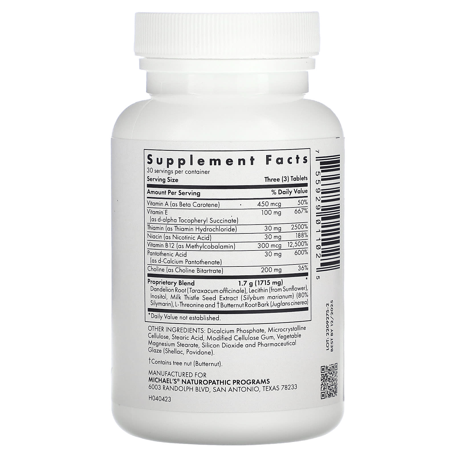 Raiz de Dente-de-Leão (Taraxacum officinale), Lecitina (de Girassol), Inositol, Extrato da Semente de Cardo Mariano (Silybum marianum) (80% de Silimarina), L-Treonina e Casca de Raiz de † Butternut (Juglans cinerea)
