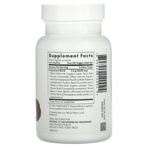 | Mistura Patenteada † Casca de Noz Preta (Juglans nigra), Bulbo de Alho (Concentrado em Pó) (Allium sativum), Semente de Mamão (Carica papaya), Casca de Pau d’Arco (Tabebuia impetiginosa), Semente de Abóbora (Cucurbita pepo), Casca de Raiz de † Butternut (Juglans) cinerea), Cravo (Botão de Flor) (Caryophyllus aromaticus), Betonieira (Erva) (Stachys officinalis) e Epazote (Erva Inteira) (Chenopodium ambrosioides var. anthelminticum) |