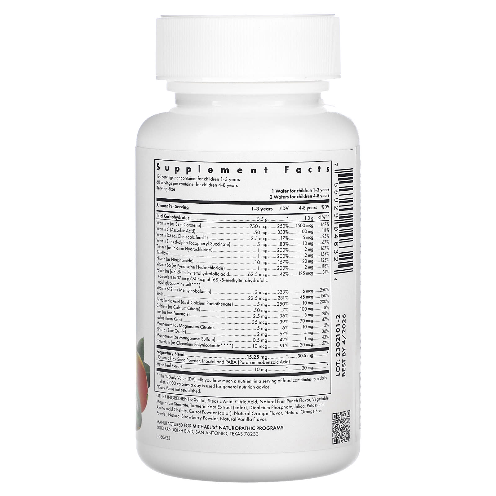 Para crianças de 1 a 3 anos de idade, mastigue 1 (um) wafer por dia com o café da manhã. Para crianças de 4 a 8 anos de idade, mastigue duas (2) bolachas por dia com o café da manhã. A dosagem pode ser aumentada conforme recomendado por um profissional de saúde. Para crianças a partir de 9 anos de idade, as multivitaminas para pré-adolescentes e adolescentes da Michael’s® estão disponíveis.