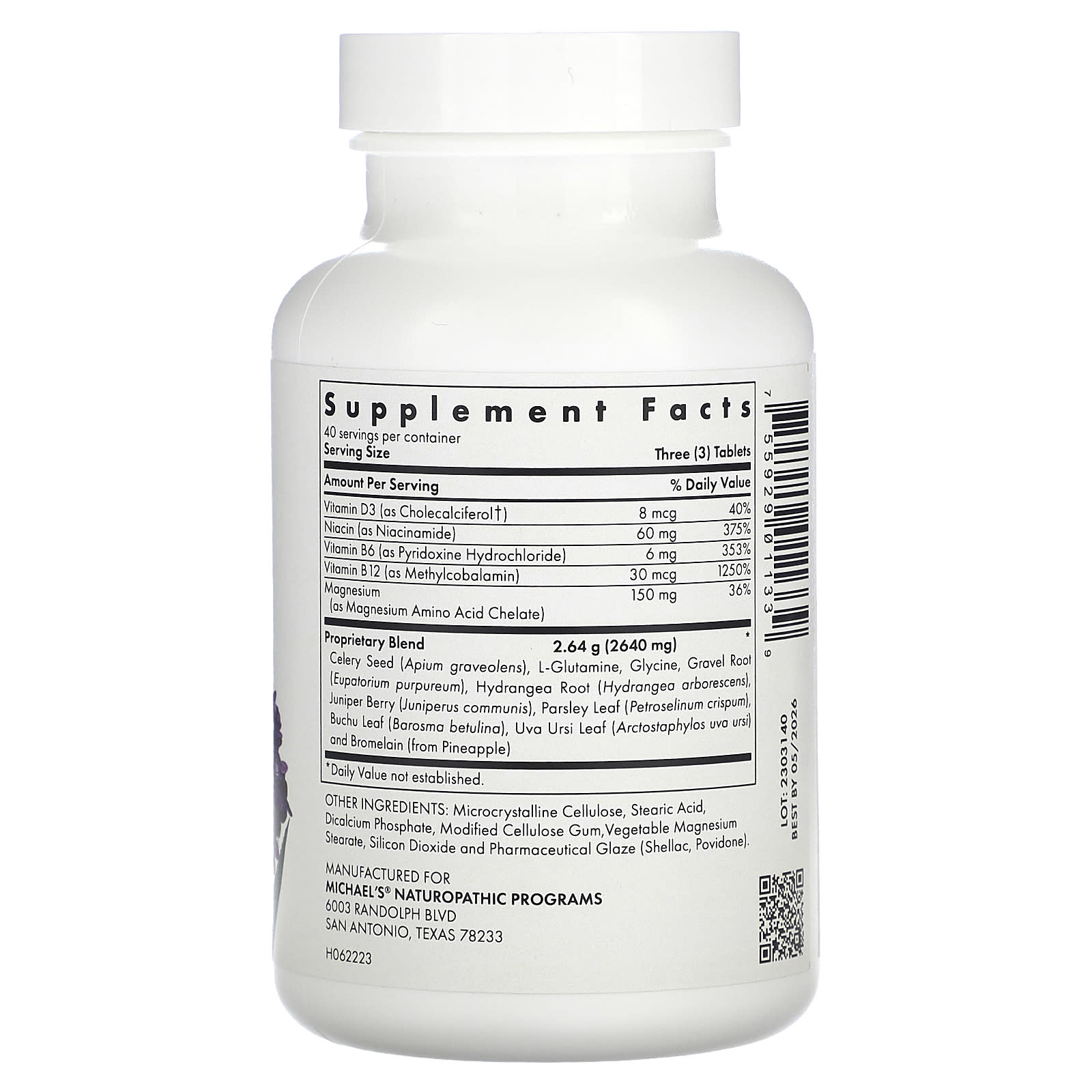 | Mistura Patenteada Semente de Aipo (Apium graveolens), L-Glutamina, Glicina, Raiz de Cascalho (Eupatorium purpureum), Raiz de Hortênsia (Hydrangea arborescens), Baga de Zimbro (Juniperus communis), Folha de Salsa (Petroselinum crispum), Folha de Buchu (Barosma betulina), Uva Ursi Folha (Arctostaphylos uva ursi) e Bromelaína (de Abacaxi) |