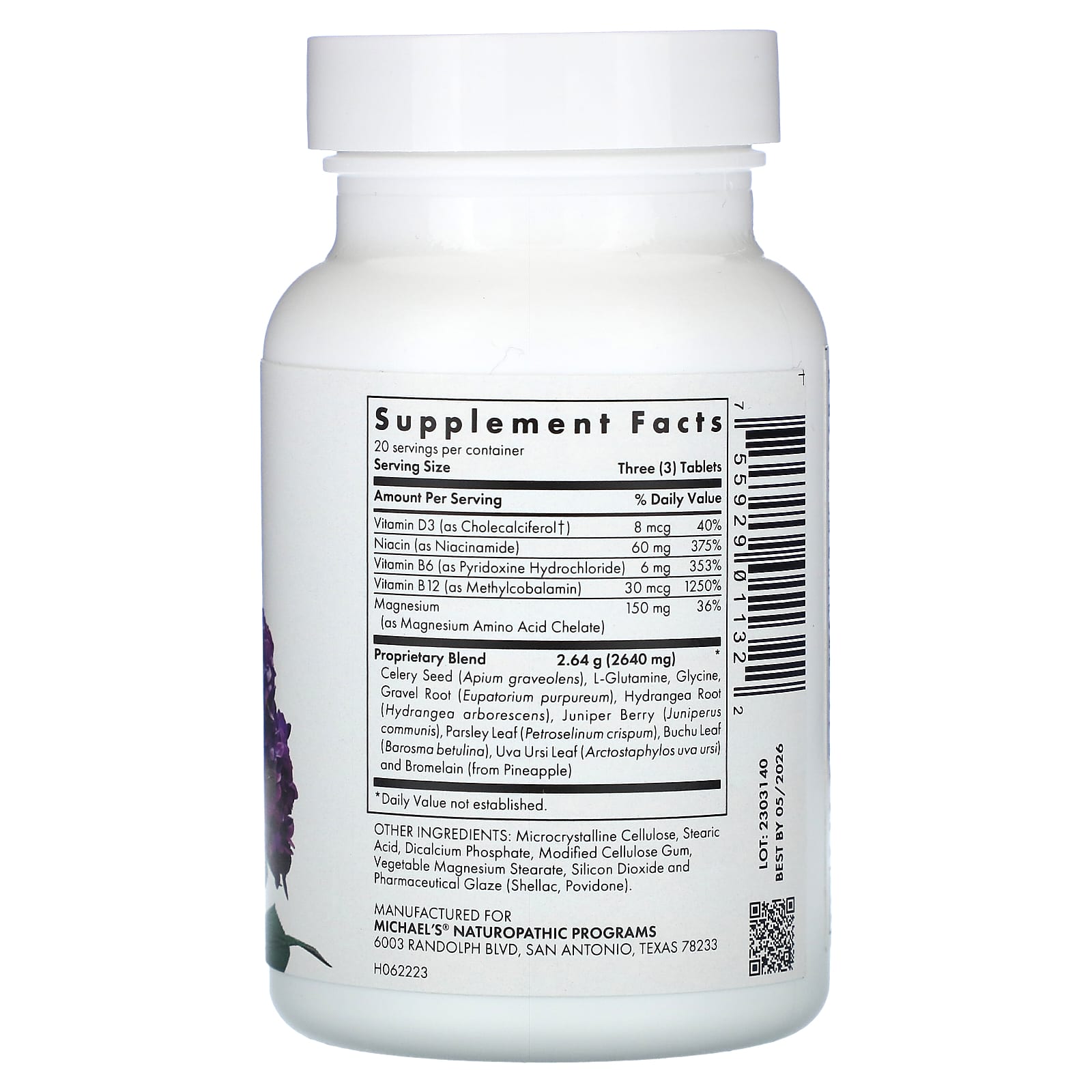| Mistura Patenteada Semente de Aipo (Apium graveolens), L-Glutamina, Glicina, Raiz de Cascalho (Eupatorium purpureum), Raiz de Hortênsia (Hydrangea arborescens), Baga de Junípero (Juniperus communis), Folha de Salsa (Petroselinum crispum), Folha de Buchu (Barosma betulina, Folha de Uva Ursi (Arctostaphylos uva ursi) e Bromelaína (de Abacaxi) |