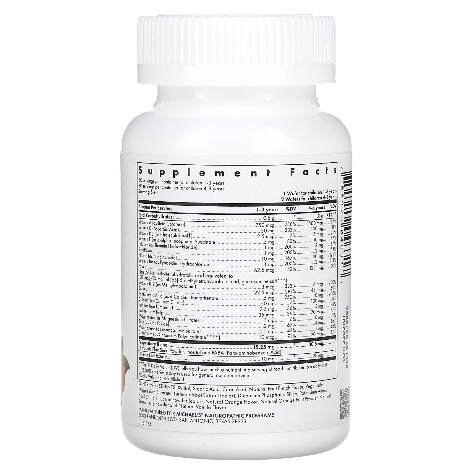 Para crianças de 1 a 3 anos de idade, mastigue 1 (um) wafer por dia com o café da manhã. Para crianças de 4 a 8 anos de idade, mastigue duas (2) bolachas por dia com o café da manhã. A dosagem pode ser aumentada conforme recomendado por um profissional de saúde. Para crianças a partir de 9 anos de idade, as multivitaminas para pré-adolescentes e adolescentes da Michael’s® estão disponíveis.