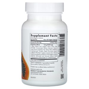 | Mistura Patenteada † Casca de Noz Preta (Juglans nigra), Bulbo de Alho (Concentrado em Pó) (Allium sativum), Semente de Mamão (Carica papaya), Casca de Pau d’Arco (Tabebuia Impetiginosa), Semente de Abóbora (Cucurbita pepo), Casca de Raiz de † Butternut (Juglans) cinerea), Cravo (Botão de Flor) (Caryophyllus aromaticus), Betonieira (Erva) (Stachys officinalis) e Epazote (Erva Inteira) (Chenopodium Ambrosioides var. anthelminticum) |