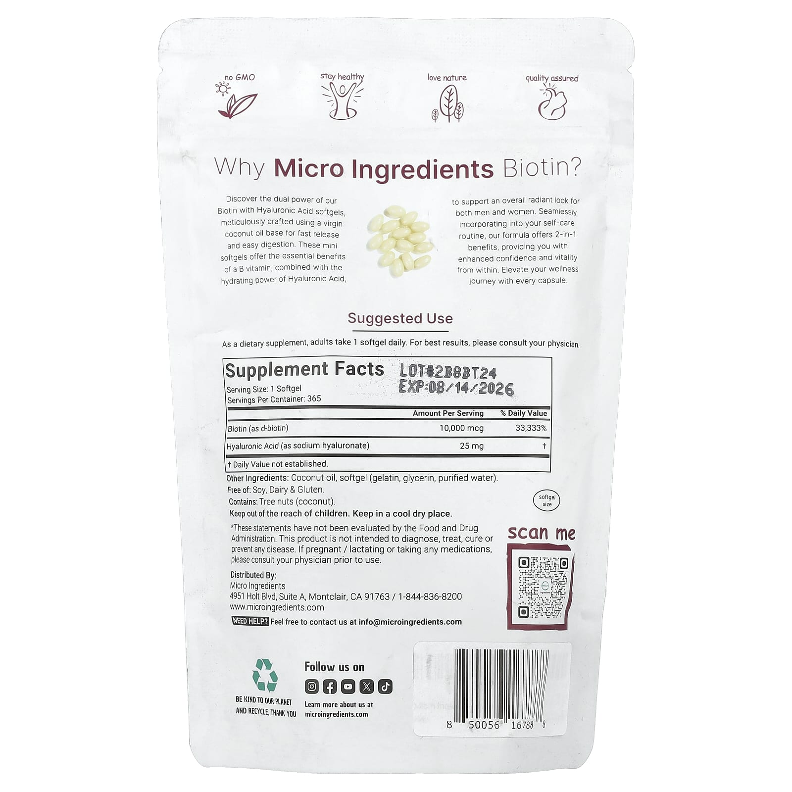 Descubra o duplo poder de nossas cápsulas softgel de Biotina com Ácido Hialurônico, meticulosamente elaboradas usando uma base de óleo de coco virgem para liberação rápida e fácil digestão. Essas minicápsulas softgel oferecem os benefícios essenciais de uma vitamina B, combinados com o poder hidratante do Ácido Hialurônico, para promover uma aparência radiante para homens e mulheres. Incorporando-se perfeitamente à sua rotina de cuidados pessoais, nossa fórmula oferece benefícios 2 em 1, proporcionando a você mais confiança e vitalidade por dentro. Eleve sua jornada de bem-estar com cada cápsula.