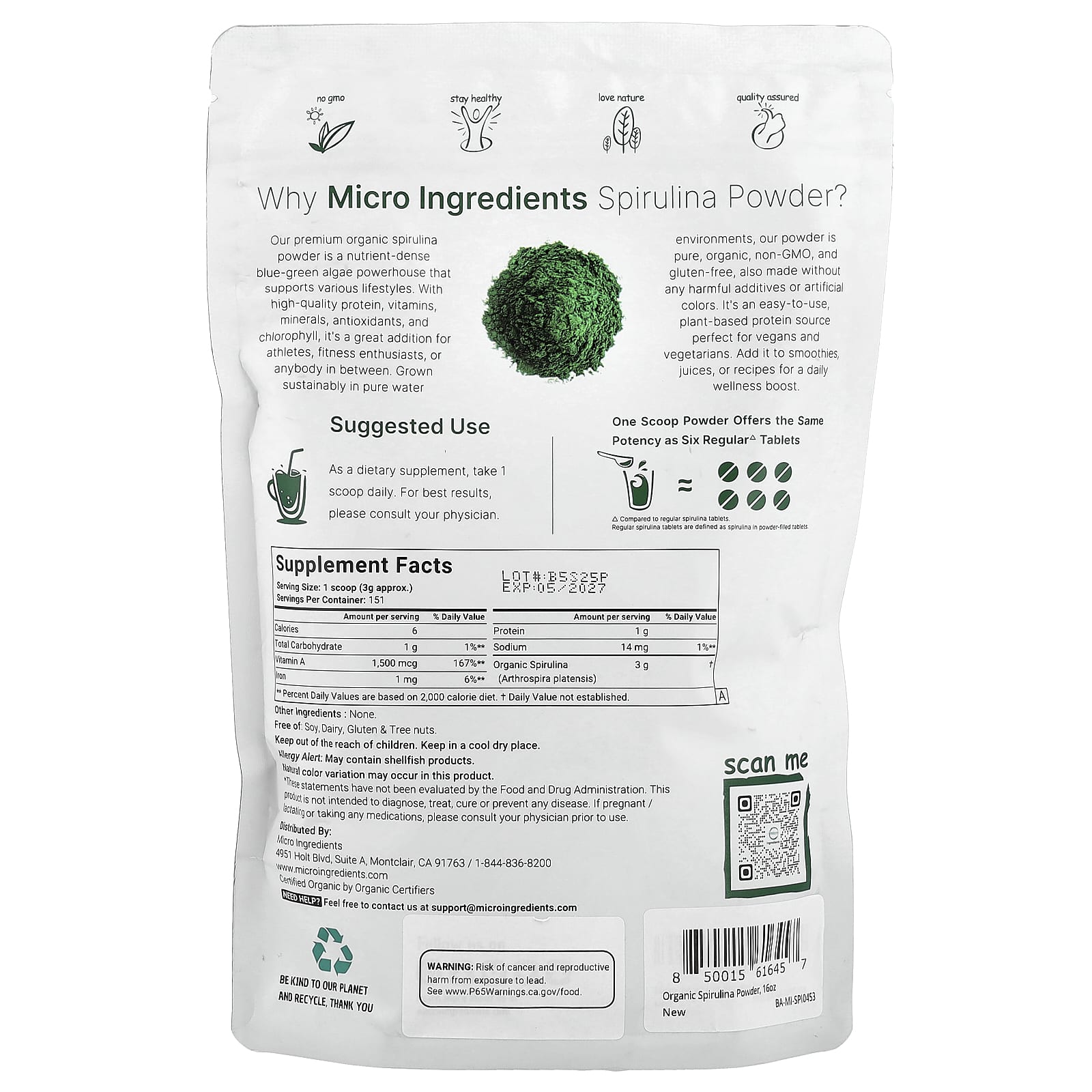 Micro Ingredients Espirulina Orgânica em Pó 454 g (1 lb) – Micro Ingredients Suplementos Superalimentos Algas Espirulina.