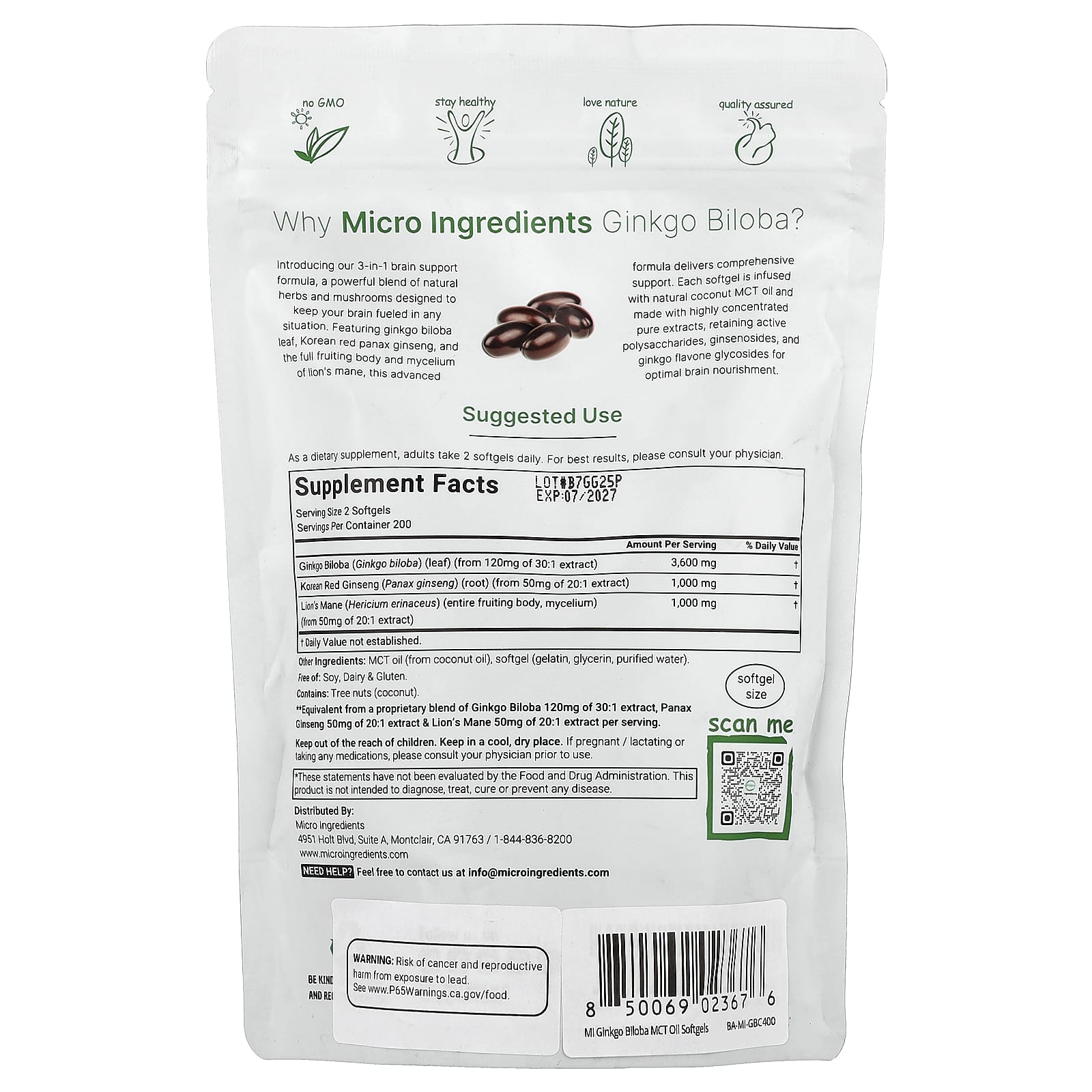 Micro Ingredients Ginkgo biloba Panax ginseng Juba-de-leão 400 Cápsulas Softgel – Micro Ingredients Suplementos Ervas Ginkgo Biloba Cogumelos Juba de Leão.