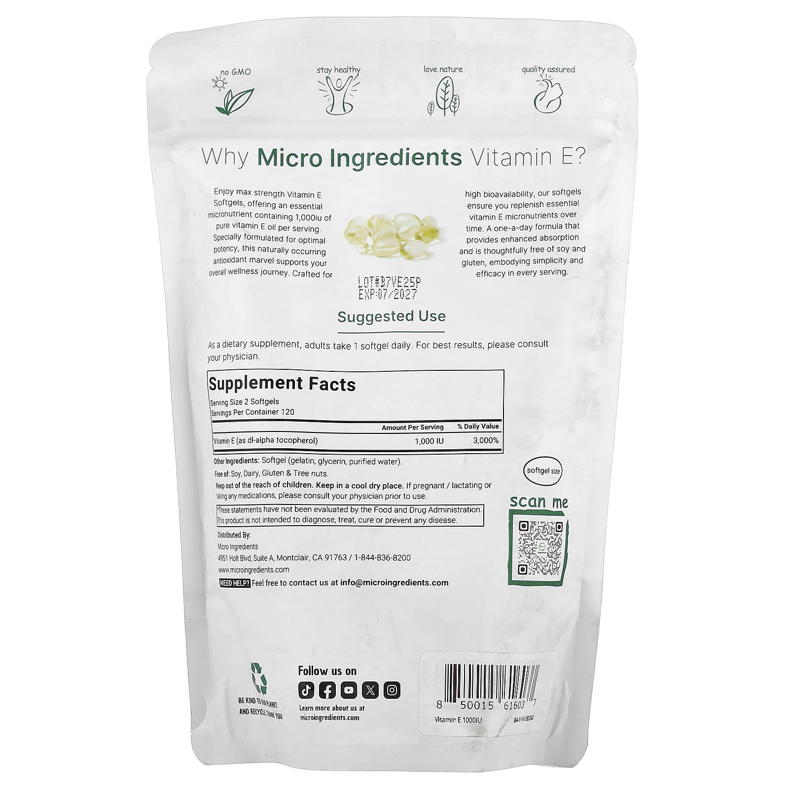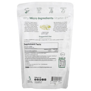 A Micro Ingredients oferece cápsulas softgel de vitamina E pura que vêm em uma fórmula diária conveniente de dose única. Ele contém ingredientes autênticos de vitamina E na forma de dextroalfatocoferol.