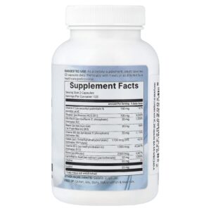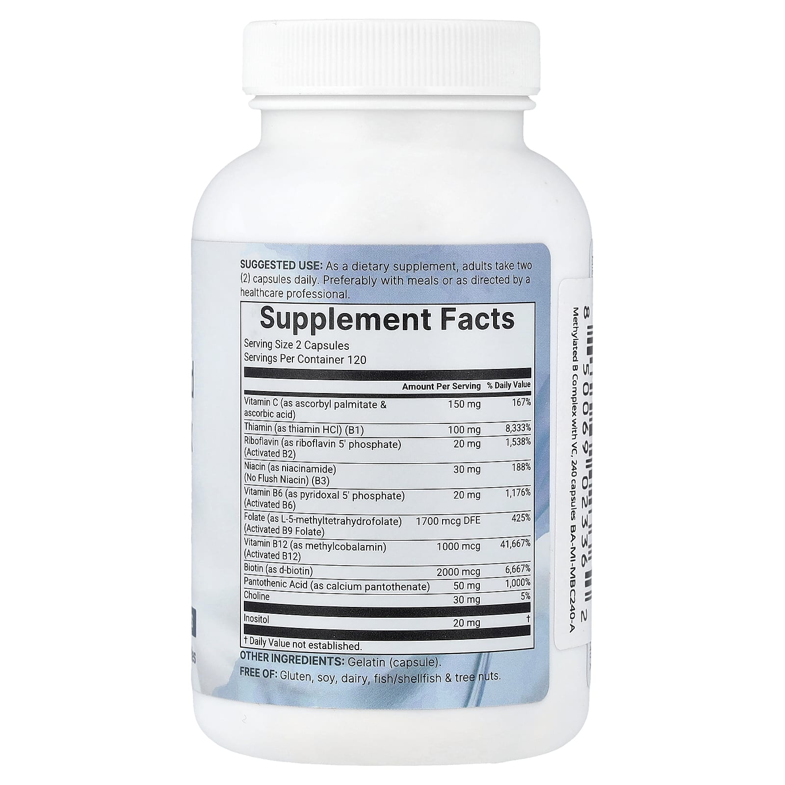 Cada frasco contém 240 cápsulas. Oferece vitamina C (palmitato de ascorbila + ácido ascórbico), tiamina, riboflavina (R5P), ácido nicotínico (nicotinamida), B6 (P5P), folato, B12 (mecobalamina), biotina, ácido pantotênico, colina e inositol por dose.