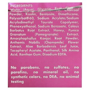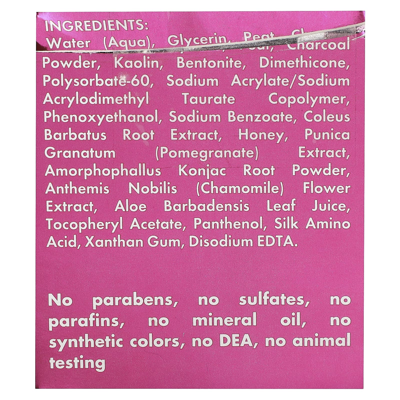 Água, glicerina, turfa, pó de carvão vegetal, caulim, bentonita, dimeticona, polisorbato-60, acriloildimetilacrilato de sódio / fenoxietanol de sódio, taurate copolymer, benzoato de sódio, extrato de raiz de Coleus barbatus, mel, extrato de Punica granatum (romã), pó da raiz de Amorphophallus konjac, extrato da flor de Anthemis nobilis (camomila), suco da folha de Aloe barbadensis, acetato de tocoferol, pantenol, aminoácido de seda, goma xantana, edetato dissódico.
