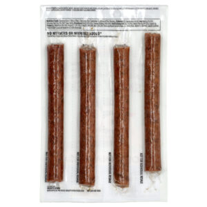 Frango, água, açúcar, sal marinho, menos de 2% de farinha de arroz, ácido cítrico encapsulado, aipo cultivado em pó (aipo em pó, sal marinho), pimenta-do-reino defumada, cereja em pó. Em invólucro de colágeno bovino colorido.