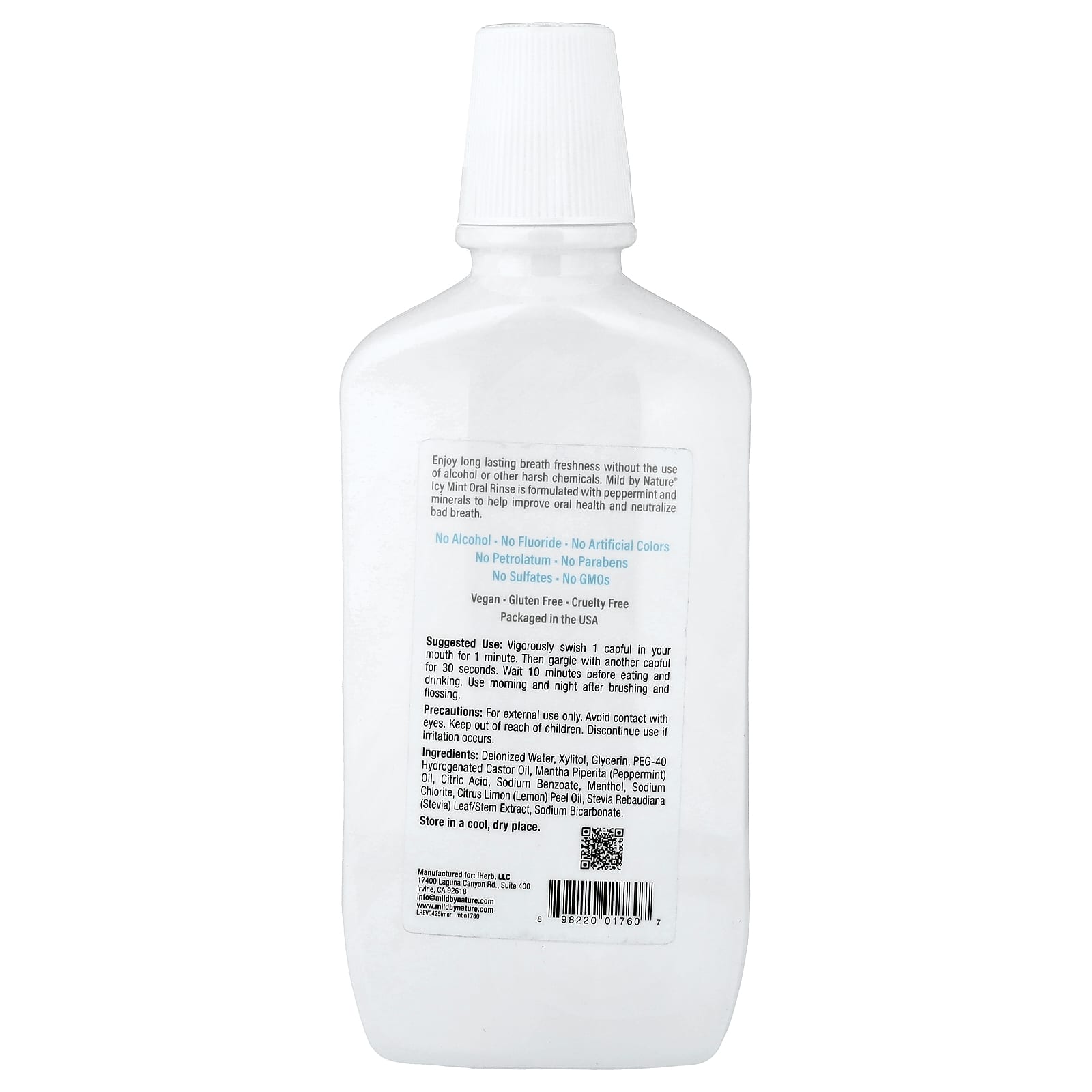 O Enxaguante Bucal de Menta Gelada da Mild by Nature é formulado com xilitol, hortelã-pimenta, mentol, minerais e óleo de rícino para melhorar a saúde bucal e neutralizar o mau hálito.*