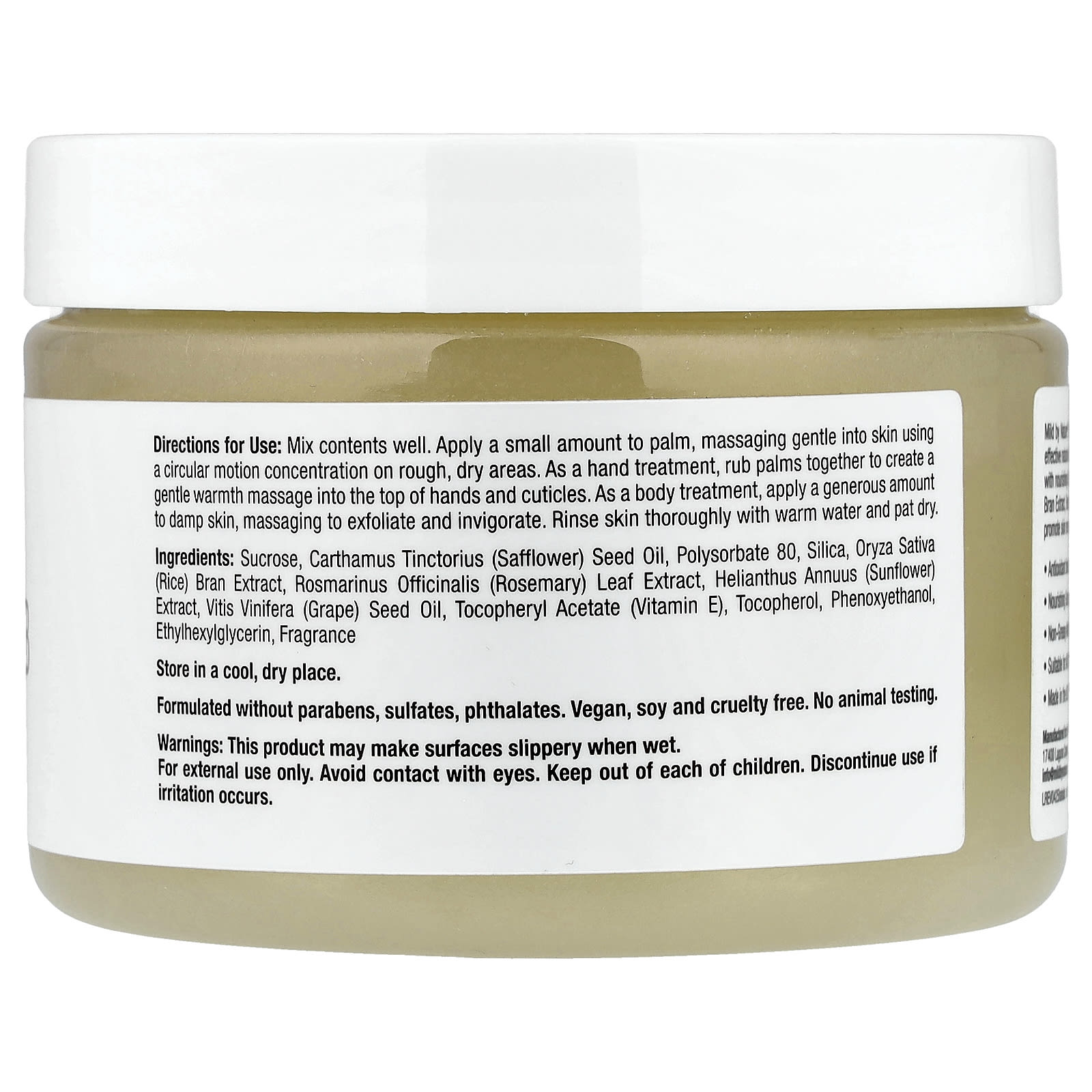 Misture bem o conteúdo. Aplique uma pequena quantidade na palma da mão e massageie a pele suavemente usando movimentos circulares e concentrando-se nas áreas ásperas e ressecadas. Como tratamento para as mãos, esfregue as palmas das mãos até massagear a parte superior das mãos e as cutículas com calor suave. Como tratamento corporal, aplique uma quantidade generosa na pele úmida, massageando para esfoliar e revigorar. Enxágue bem na pele com água morna e seque.