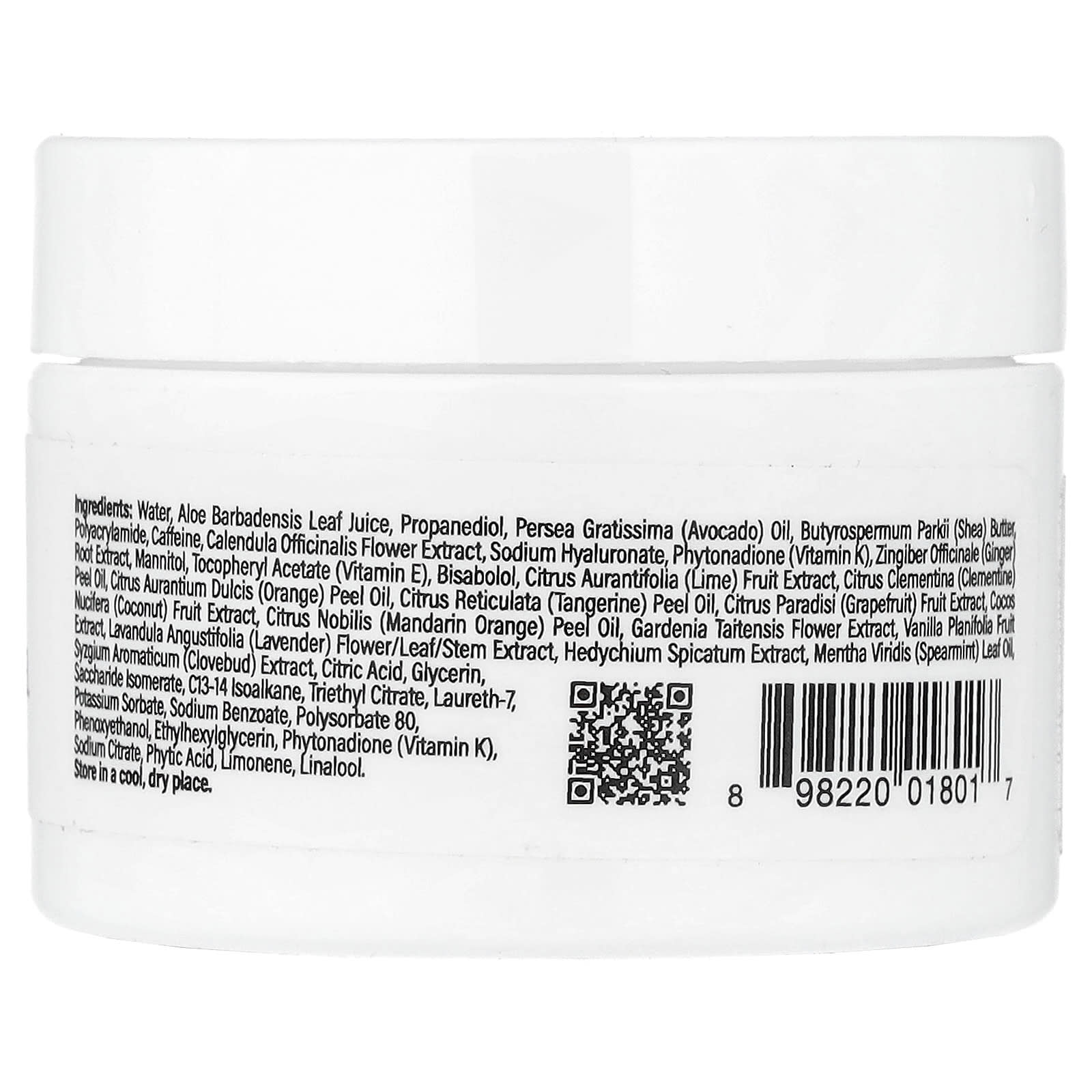 Água, Suco da Folha de Aloe barbadensis, Propanediol, Óleo de Persea gratissima (Abacate), Manteiga de Butyrospermum parkii (Karité), Poliacrilamida, Cafeína, Extrato da Flor de Calendula officinalis, Hialuronato de Sódio, Fitomenadiona (Vitamina K), Extrato da Raiz de Zingiber officinale (Gengibre), Manitol, Acetato de Racealfatocoferol (Vitamina E), Bisabolol, Extrato da Fruta de Citrus aurantifolia (Lime), Óleo da Casca de Citrus clementina (Clmentina), Óleo da Casca de Citrus aurantium dulcis (Laranja), Óleo da Casca de Citrus reticulta (Tangerina), Extrato da Fruta de Citrus paradisi (Toranja), Extrato da Fruta de Cocos nucifera (Coco), Óleo da Casca de Citrus nobilis (Mandarina), Extrato da Flor de Gardenia taitensis, Extrato da Fruta de Vanilla planifolia, Extrato de Flor/Folha/Caule de Lavandula angustifolia (Lavanda), Extrato de Hedychium spicatum, Óleo de Folha de Mentha viridis (hortelã), Extrato de Syzgium aromaticum (Cravo), Ácido Cítrico, Glicerina, Saccharide Isomerate, Isoalcano C13-14, Citrato de Trietilo, Laureth-7, Sorbato de Potássio, Benzoato de Sódio, Polissorbato 80, Fenoxietanol, Ethylhexylglycerin, Fitomenadiona (Vitamina K), Citrato de Sódio, Ácido Fítico, Limoneno, Linalool.