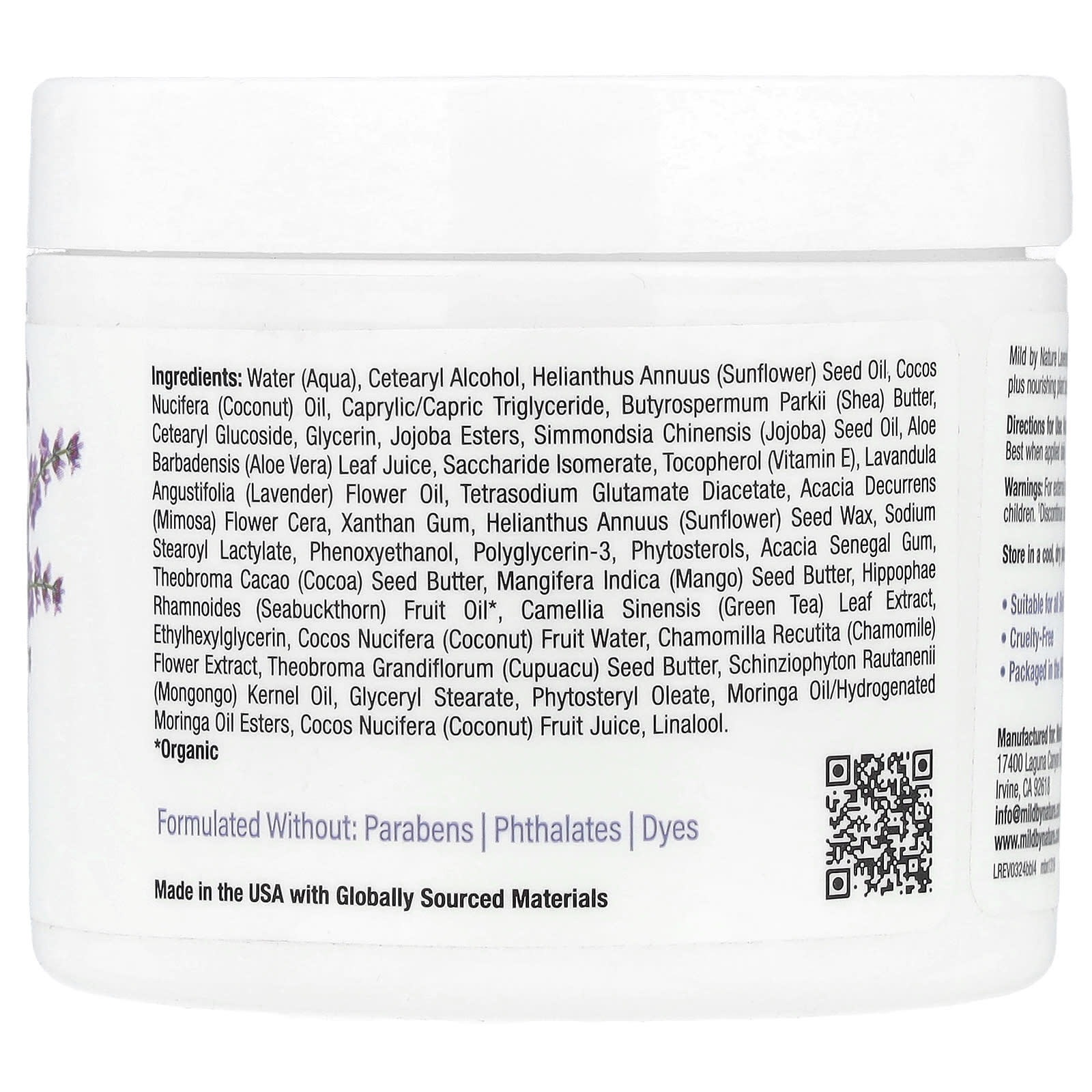 A Manteiga Corporal de Lavanda da Mild by Nature contém Manteiga de Karité e Óleo de Moringa, além de fitoesteróis nutritivos à base de plantas, para manter a aparência saudável e hidratada da pele.