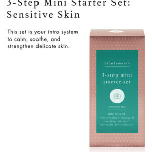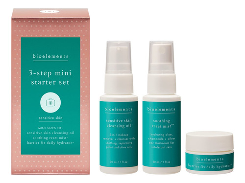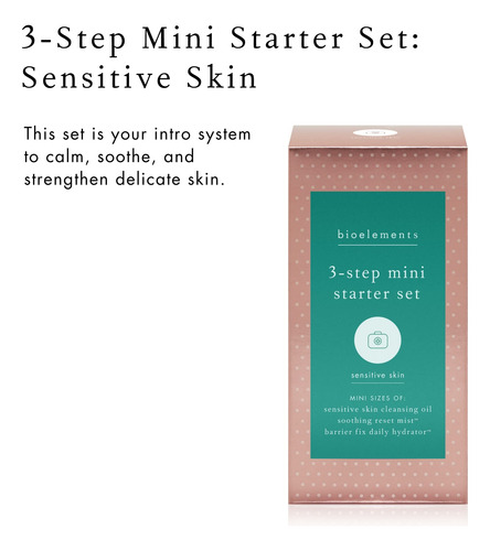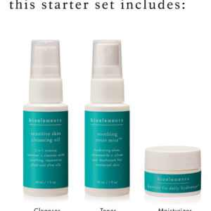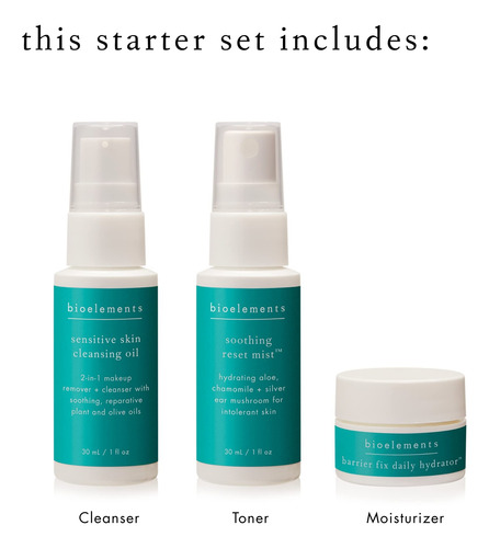 Mini conjunto inicial Bioelements de 3 etapas: pele sensível — inclui óleo de limpeza, tônico calmante Reset Mist e hidratante hidratante diário Barrier Fix — vegano, sem glúten — nunca testado em animais