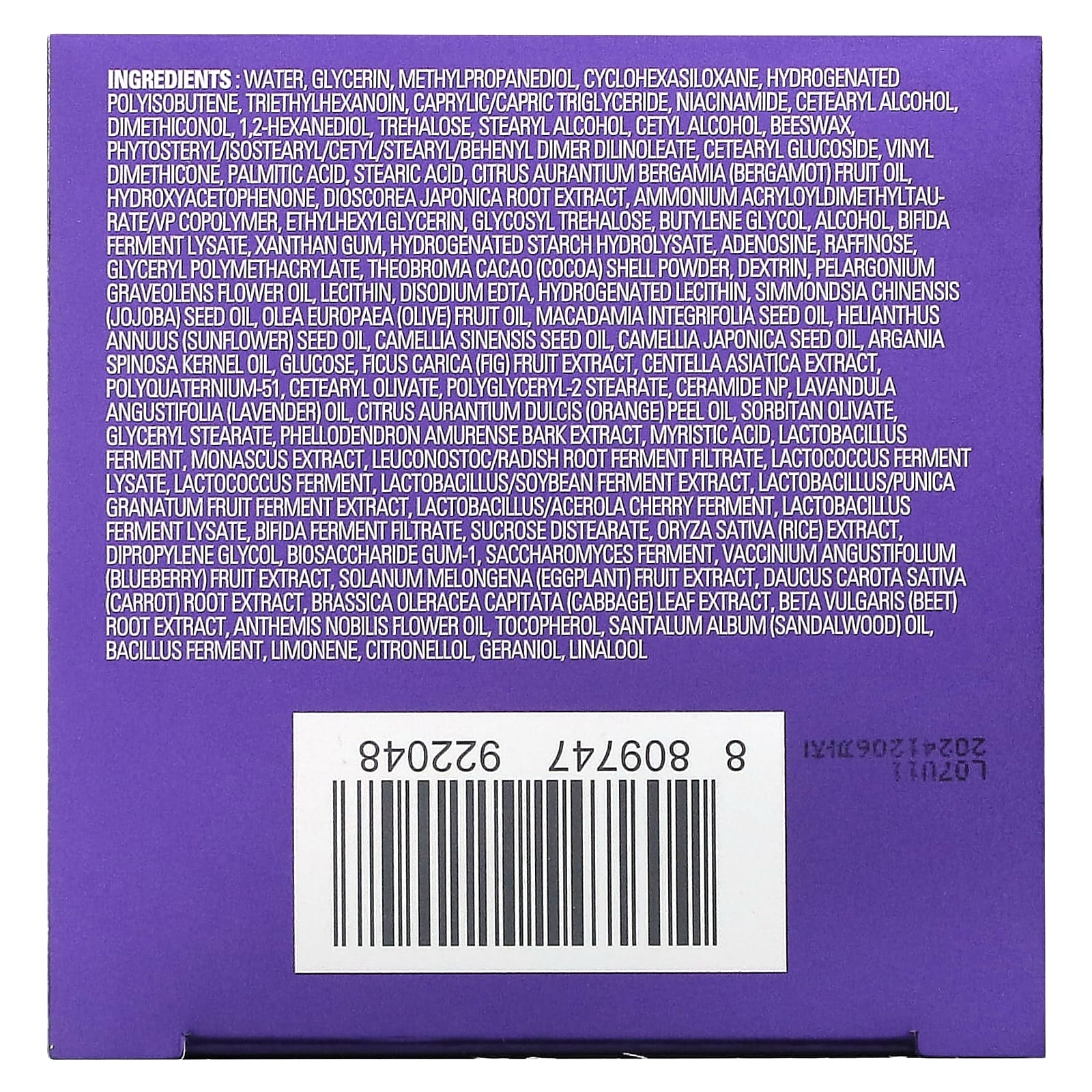 Água, glicerina, methylpropanediol, cyclohexasiloxane, hydrogenated polyisobutene, triethylhexanoin, caprylic/capric triglyceride, nicotinamida, álcool cetearílico, dimeticonol, 1,2-hexanediol, trealose, álcool estearílico, álcool cetílico, cera de abelha, dilinoleato de dímero de fitosterila / isoestearila / cetila / estearila / beenila, glicopiranosídeo cetoestearílico, dimeticona de vinil, ácido palmítico, ácido esteárico, Citrus aurantium bergamia (óleo da fruta bergamota), hidroxiacetofenona, extrato da raiz de Discorea japonica, ammonium acryloyldimethyltaurate/vp copolymer, ethylhexylglycerin, glicosil trealose, butilenoglicol, álcool, lisado do fermento de bífida, goma xantana, hidrolisado de amido hidrogenado, adenosina, rafinose, polimetacrilato de glicerila, pó da casca de Theobroma cacao (cacau), dextrina, óleo da flor de Pelargonium graveolens, lecitina, edetato dissódico, hydrogenated lecithin, óleo da semente de Simmondsia chinensis (jojoba), óleo da fruta de Olea europaea (azeitona), óleo da semente de Macadamia integrifolia, óleo da semente de Helianthus annuus (girassol), óleo da semente de Camellia sinensis, óleo da semente de Camellia japonica, óleo do grão de Argania spinosa, glicose, extrato da fruta de Ficus carica (figo), extrato de centela asiática, poliquatérnio-51, cetearyl olivate, polyglyceryl-2 stearate, ceramide NP, óleo de Lavandula angustifolia (lavanda), óleo da casca de Citrus aurantium dulcis (laranja), olivato de sorbitano, estearato de glicerila, extrato da casca de Phellodendron amurense, ácido mirístico, fermento de lactobacillus, extrato de monascus, filtrado da fermentação da raiz de rabanete/leuconostoc, lisado do fermento de Lactococcus, fermento de lactococcus, extrato de fermentação de soja/lactobacillus, extrato de fermento de fruta lactobacillus / punica granatum, fermento de lactobacilos / acerola, lisado do fermento de lactobacilos, filtrado de fermento de bífida, diestearato de sacarose, extrato de Oryza sativa (arroz), dipropilenoglicol, biosaccharide gum-1, fermento de Saccharomyces, extrato da fruta de Vaccinium angustifolium (mirtilo), extrato da fruta de Solanum melongena (berinjela), extrato da raiz de Daucus carota sativa (cenoura), extrato da folha de Brassica oleracea capitata (repolho), extrato de raiz de Beta vulgaris (beterraba), óleo da flor de Anthemis nobilis, tocoferol, óleo de Santalum album (sândalo), fermento de bacilo, limoneno, citronellol, geraniol, linalol.