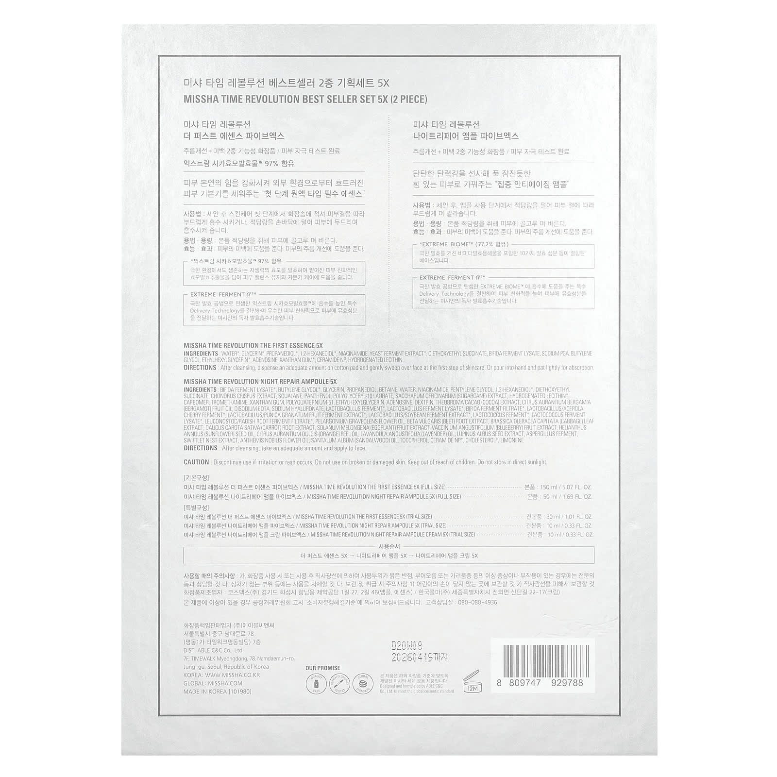 Missha Time Revolution A Primeira Essência 5x: Água*, glicerina*, propanediol*, 1,2-hexanediol*, nicotinamida, extrato de fermento de levedura*, succinato de dietoxietil, lisado do fermento de bífida, pidolato de sódio, butilenoglicol, ethylhexylglycerin*, adenosina, goma xantana*, ceramida NP, lecitina hidrogenada.