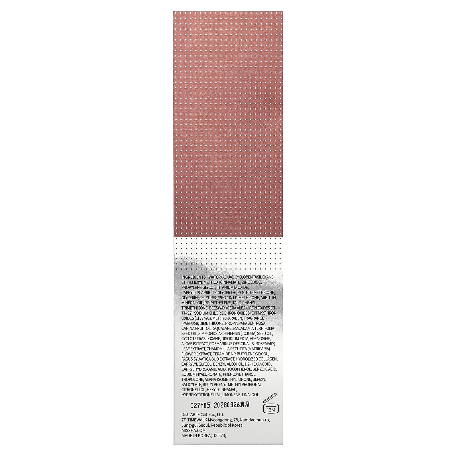 | Ingredientes Inativos: Água, decametilciclopentasiloxano, ethylhexyl methoxycinnamate, óxido de zinco, propilenoglicol, dióxido de titânio, caprylic/capric triglyceride, peg-10 dimethicone, glicerina, cetyl peg/ppg-10/1 dimethicone, arbutin, óleo mineral, polietileno, talco, fenil trimeticona, cera de abelha, óxidos de ferro (CI 77492), cloreto de sódio, óxidos de ferro (CI 77499), óxidos de ferro (CI 77491), metilparabeno, dimeticona, propilparabeno, óleo da fruta de Rosa canina, esqualano, óleo da semente de Macadamia ternifolia, semente de Simmondsia chinensis (jojoba) óleo, decametilciclotetrasiloxano, edetato dissódico, adenosina, extrato de algas, extrato da folha de Rosmarinus officinalis (alecrim), extrato da flor de Chamomilla recutita (camomila), ceramide NP, butylene glycol, extrato do botão de Fagus sylvatica, colágeno hidrolisado, caprylyl glycol, benzyl alcohol, 1, 2-hexanediol, caprylhydroxamic acid, tocoferol, ácido benzoico, hialuronato de sódio, fenoxietanol, tropolona, fragrância, butylphenyl methylpropical, benzyl salicylate, hydroxycitrollal, alpha-isomethyl ionone, hexyl cinna amal, linalol, citronelol, limoneno. | |