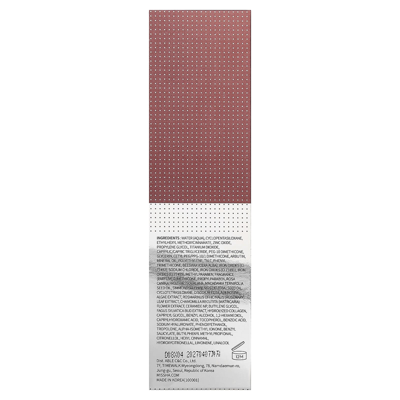 | Água, decametilciclopentasiloxano, propilenoglicol, caprylic/capric triglyceride, peg-10 dimethicone, glicerina, cety[ peg/ppg-10/1 dimethicone, arbutin, óleo mineral, polietileno, talco, fenil. triethicone, cera de abelha (cera alba), óxido férrico amarelo, cloreto de sódio, óxido férrico vermelho, óxido ferrosobárrico, metilparabeno, dimeticona, propilparabeno, óleo da fruta de Rosa canina, esqualano, óleo da semente de Macadamia ternifolia, óleo da semente de Simmondsia chinensis (jojoba), ciclotetrasiloxano, disodium edta_ adenosina, extrato de algas, extrato da folha de Rosmarinus officinalis (alecrim), extrato da flor de Chamomilla recutita (camomila), ceramide NP, butylene glycol, extrato do botão de Fagus sylvatica, colágeno hidrolisado, caprylyl glycol, benzyl alcohol, 1,2-hexanediol, caprylhydroxamic ácido, tocoferol, ácido benzoico, hialuronato de sódio, fenoxietanol, tropol um, fragrância (perfume), butylphenyl methylpropional, benzyl salicylate, hydroxycitrollal, alpha-isomethyl l’onone, hexyl cinamal, linalol, citronellol, limonene. | |