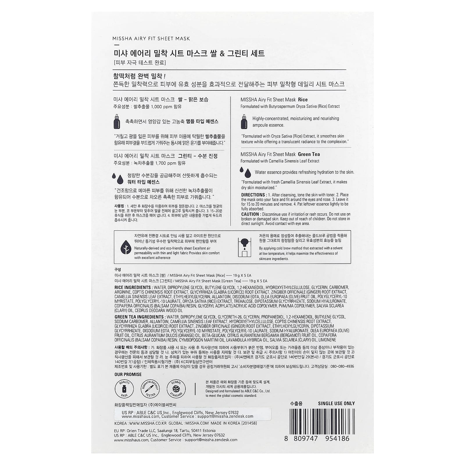 Missha Máscara Facial de Beleza Airy Fit Arroz e Chá Verde 10 Máscaras 19 g (067 oz) Cada – Missha Beleza Máscaras Faciais de Beleza Máscaras Faciais Máscaras em folha K-Beauty.
