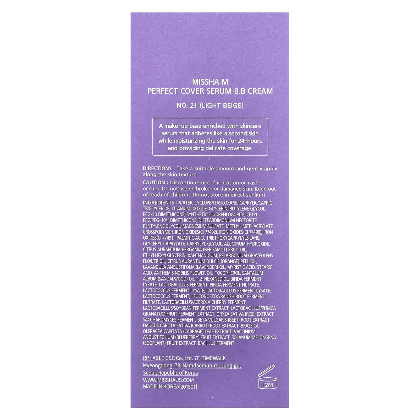 Missha Perfect Cover Serum BB Cream N.º 21 Bege Claro 35 ml (118 fl oz) – Missha Beleza Maquiagem Rosto Cremes BB e CC BB e CC creams K-Beauty.