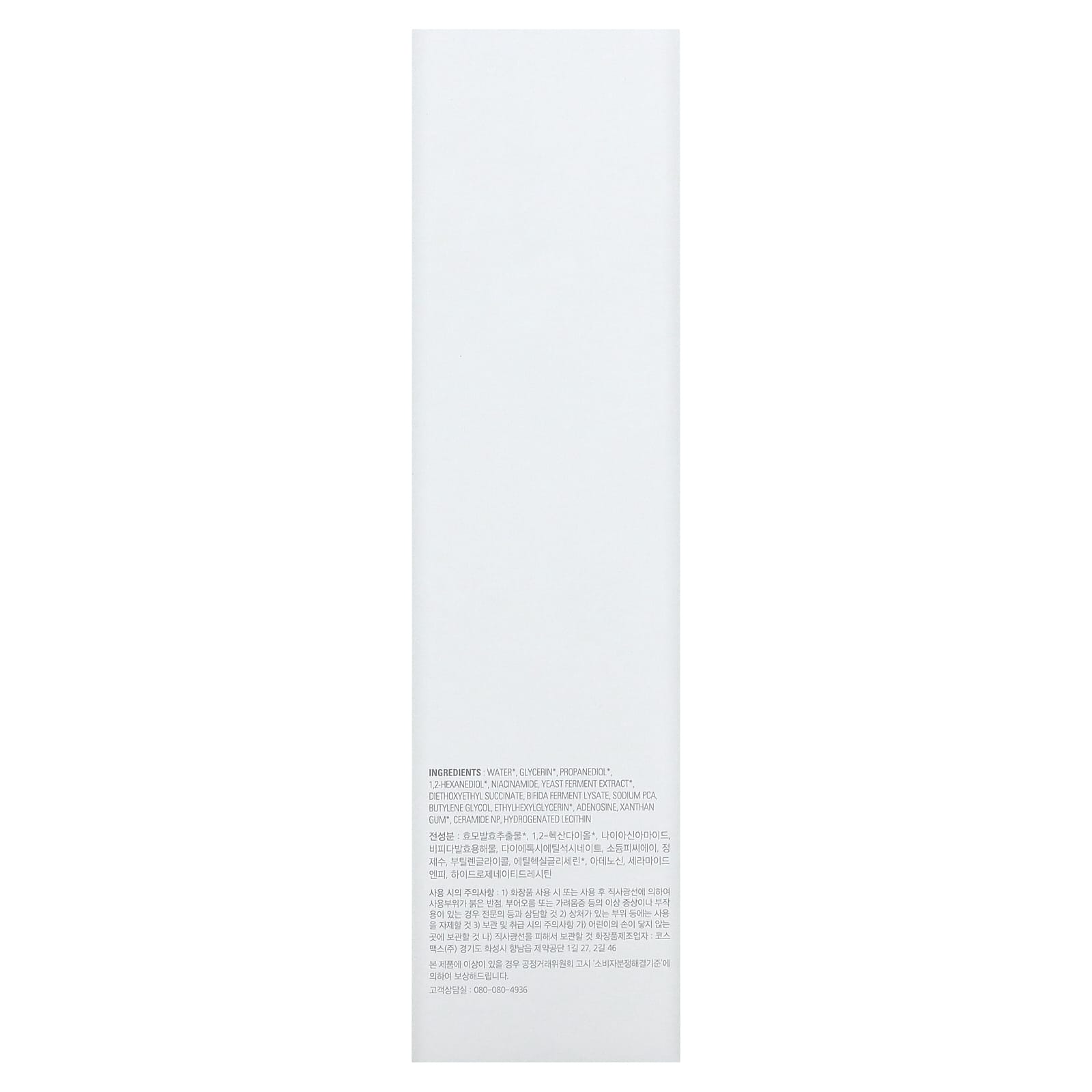 Água, glicerina, propanediol, 1,2-hexanediol, nicotinamida, extrato de fermento de levedura, succinato de dietoxietila, lisado do fermento de bífida, pca de sódio, butilenoglicol, ethylhexylglycerin, adenosina, goma xantana, ceramide NP, lecitina hidrogenada.