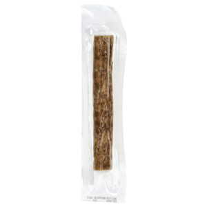 Carne de Gado Criado no Pasto, contém menos de 2% do seguinte: sal marinho, especiarias (incluindo alho em pó e cebola em pó), aipo cultivado em pó (sal marinho, aipo em pó cultivado), ácido cítrico encapsulado. recheado em uma invólucro de colágeno bovino.