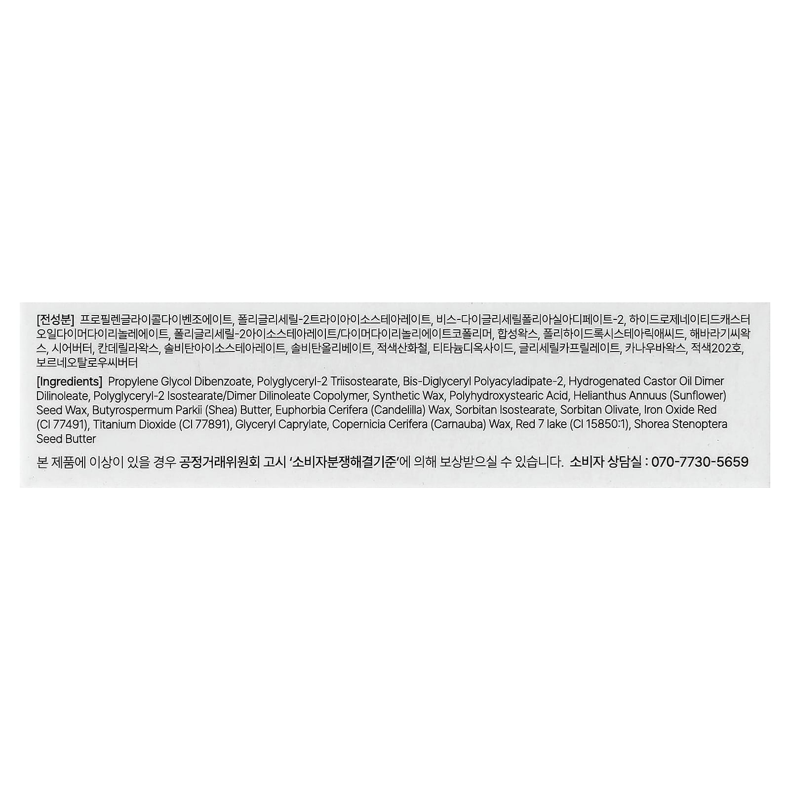 Dibenzoato de propilenoglicol, polyglyceryl-2 triisostearate, bis-digliceril poliaciladipato-2, dilinoleato de rícino hidrogenado, polyglyceryl-2 isostearate/dimer dilinoleate copolymer, cera sintética, ácido polihidroxiesteárico, cera da semente de Helianthus annuus (girassol), Manteiga de Butyrospermum ParkII (Karité), Cera de Euphorbia cerifera (candelilla), isoestearato de sorbitana, olivato de sorbitano, vermelho de óxido de ferro (CI 77491), Dióxido de titânio (CI 77891), caprilato de glicerilo, Cera de Copernicia Cerifera (Carnaúba), vermelho 7 laca de alumínio (CI 15850:1), manteiga da semente de Coasta stenopera.