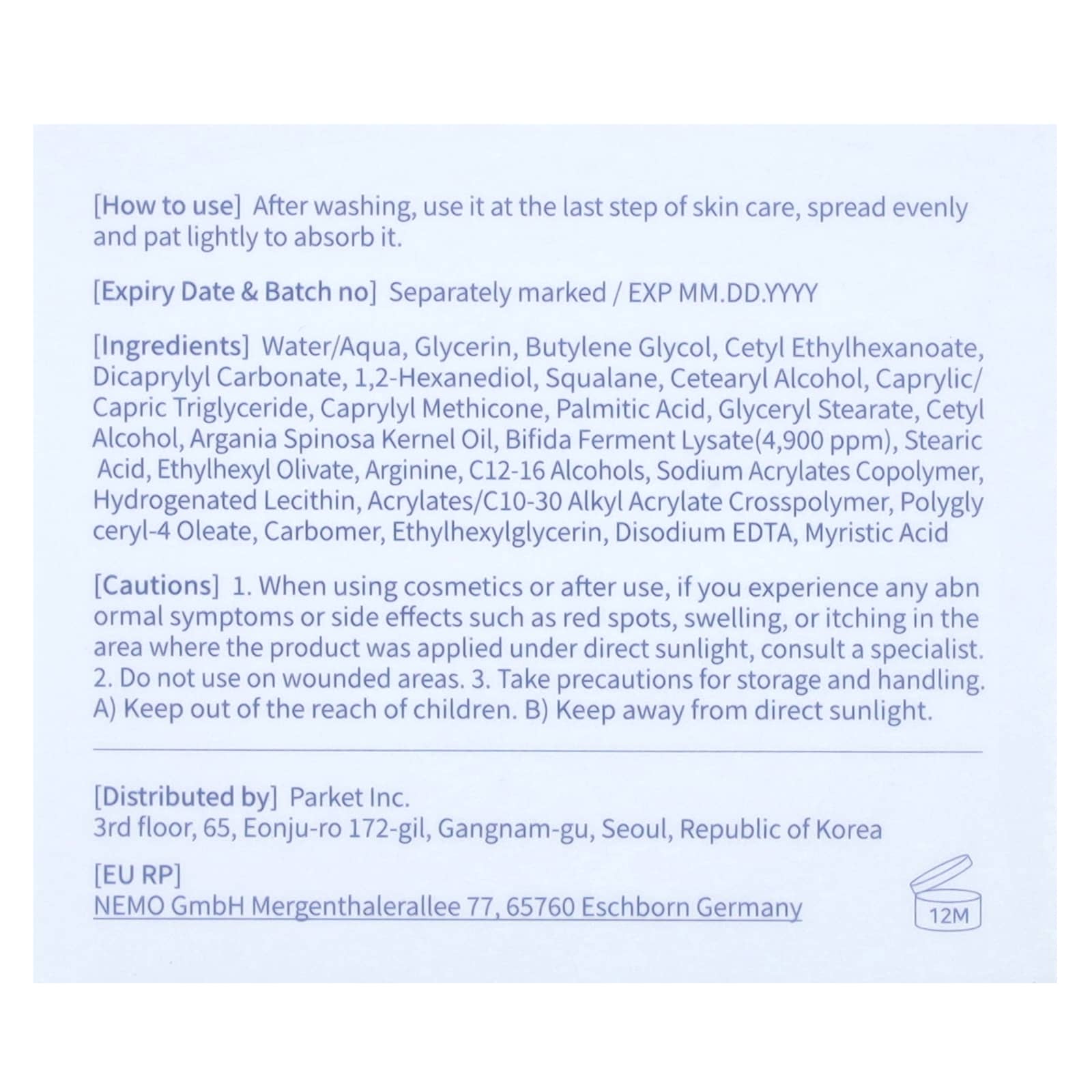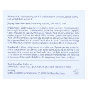 Água, glicerina, butilenoglicol, etilcaproato de cetila, dicaprylyl carbonate, 1,2-hexanediol, esqualano, álcool cetoestearílico, caprylic/capric triglyceride, caprylyl methicone, ácido palmítico, monoestearato de glicerila, álcool cetílico, óleo do grão de Argania spinosa, lisado de fermento de bífida (4.900 ppm), ácido esteárico, ethylhexyl olivate, arginina, c12-16 alcohols, sodium acrylates copolymer, lecitina hidrogenada, acrylates/c10-30 alkyl acrylate crosspolymer, oleato de poliglicerila-4, carbômero, ethylhexylglycerin, edetato dissódico, ácido mirístico.