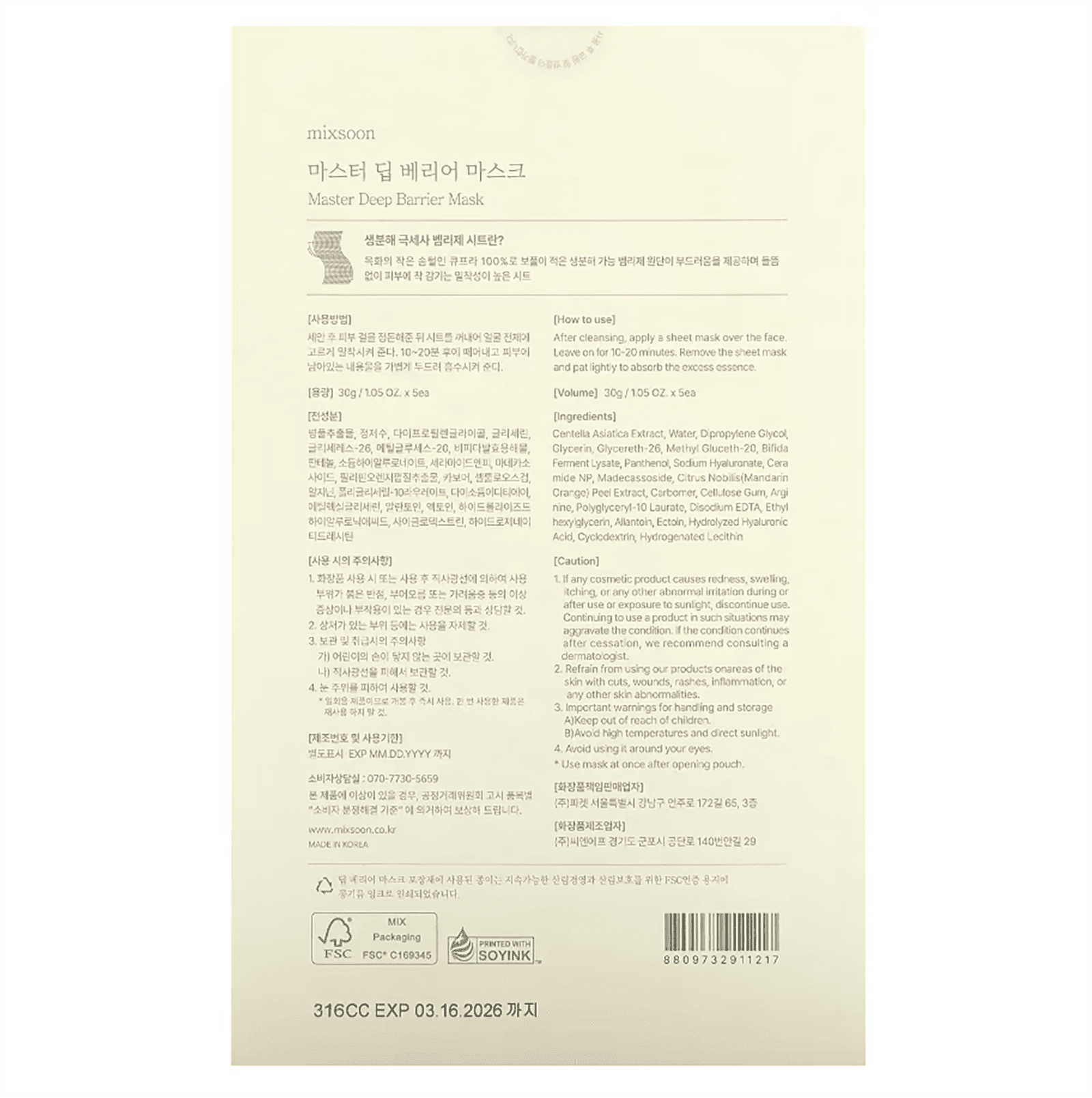 Mixsoon Máscara Máscara de Barreira Profunda 5 Folhas de Máscara 30 g (105 oz) – Mixsoon Beleza Máscaras Faciais de Beleza Máscaras Faciais Máscaras em folha K-Beauty.