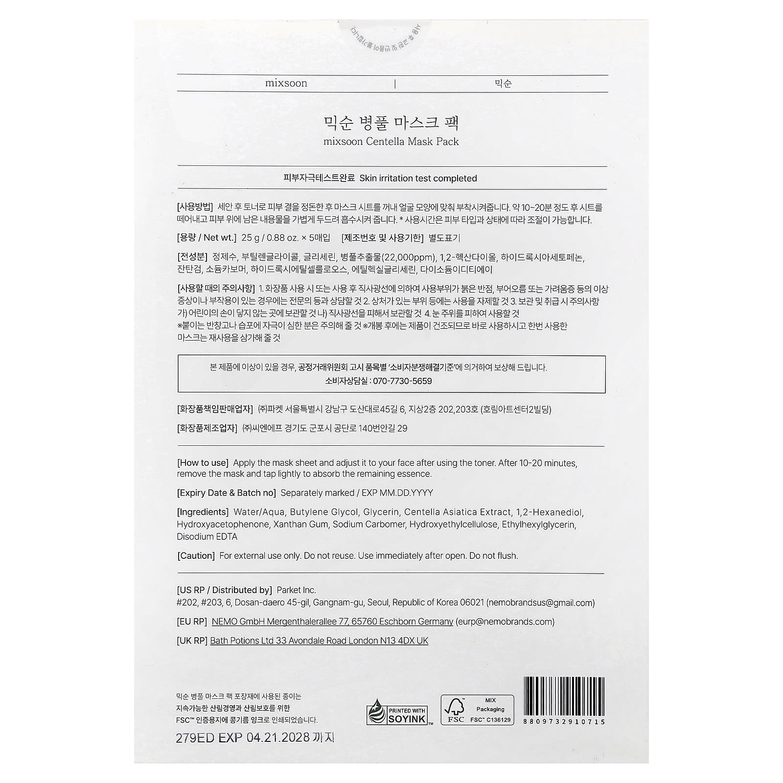 Mixsoon Pacote de Máscara de Beleza de Centella 5 Máscaras 25 g (088 oz) Cada – Mixsoon Beleza Máscaras Faciais de Beleza Máscaras Faciais Máscaras em folha K-Beauty.