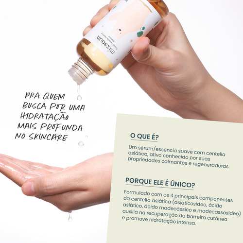 Seu principal ingrediente é a Centella Asiática (Cica), cultivada e colhida pela própria Mixsoon na Ilha de Jeju, uma região da Coreia conhecida pela pureza de sua natureza e solo vulcânico rico em minerais.