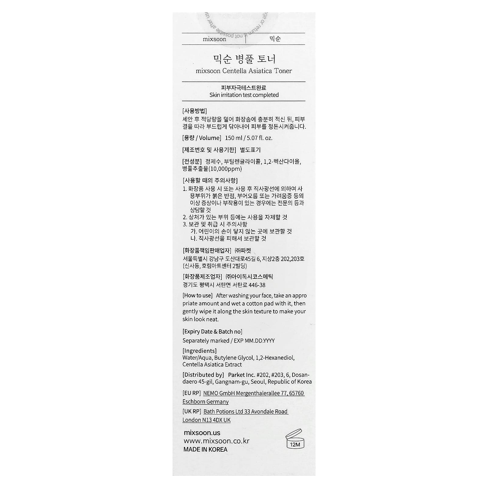 Mixsoon Tônico de Centella asiatica 150 ml (507 fl oz) – Mixsoon Beleza Limpeza Facial Loções tônicas Beleza por Ingrediente Cuidado para a pele com Centella.
